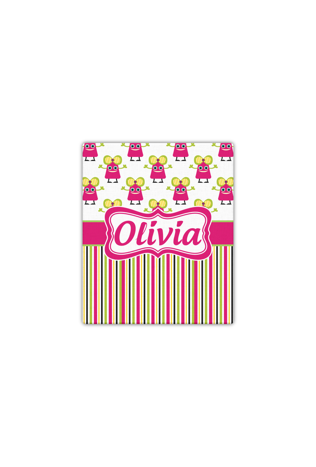 Not all little monsters have to be scary. Our one of kind girly girl monster pattern will sure to delight your little one. This little hot pink monster is decorated with a huge green, yellow, and purple bow. Set on a white background she is just begging for a hug. A classic candy striped pattern below using coordinating colors brings this design together. A wide hot pink band trimmed in lime green adds a designer touch.