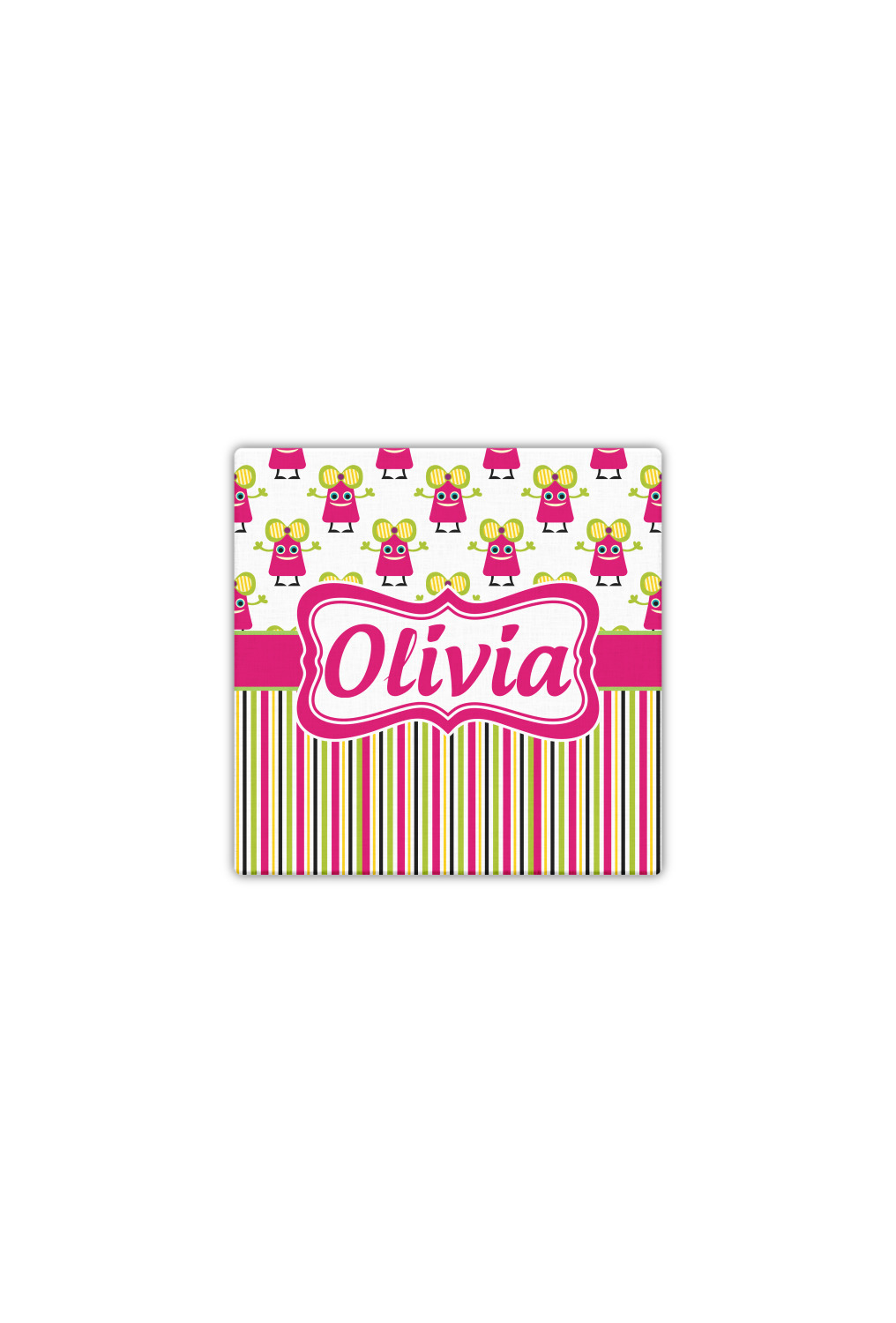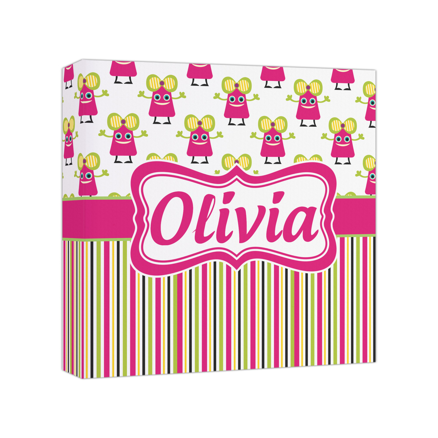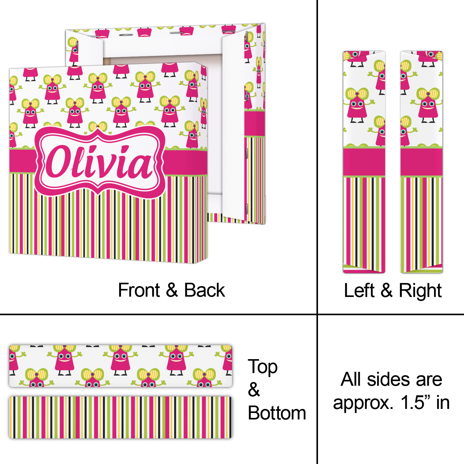 Not all little monsters have to be scary. Our one of kind girly girl monster pattern will sure to delight your little one. This little hot pink monster is decorated with a huge green, yellow, and purple bow. Set on a white background she is just begging for a hug. A classic candy striped pattern below using coordinating colors brings this design together. A wide hot pink band trimmed in lime green adds a designer touch.