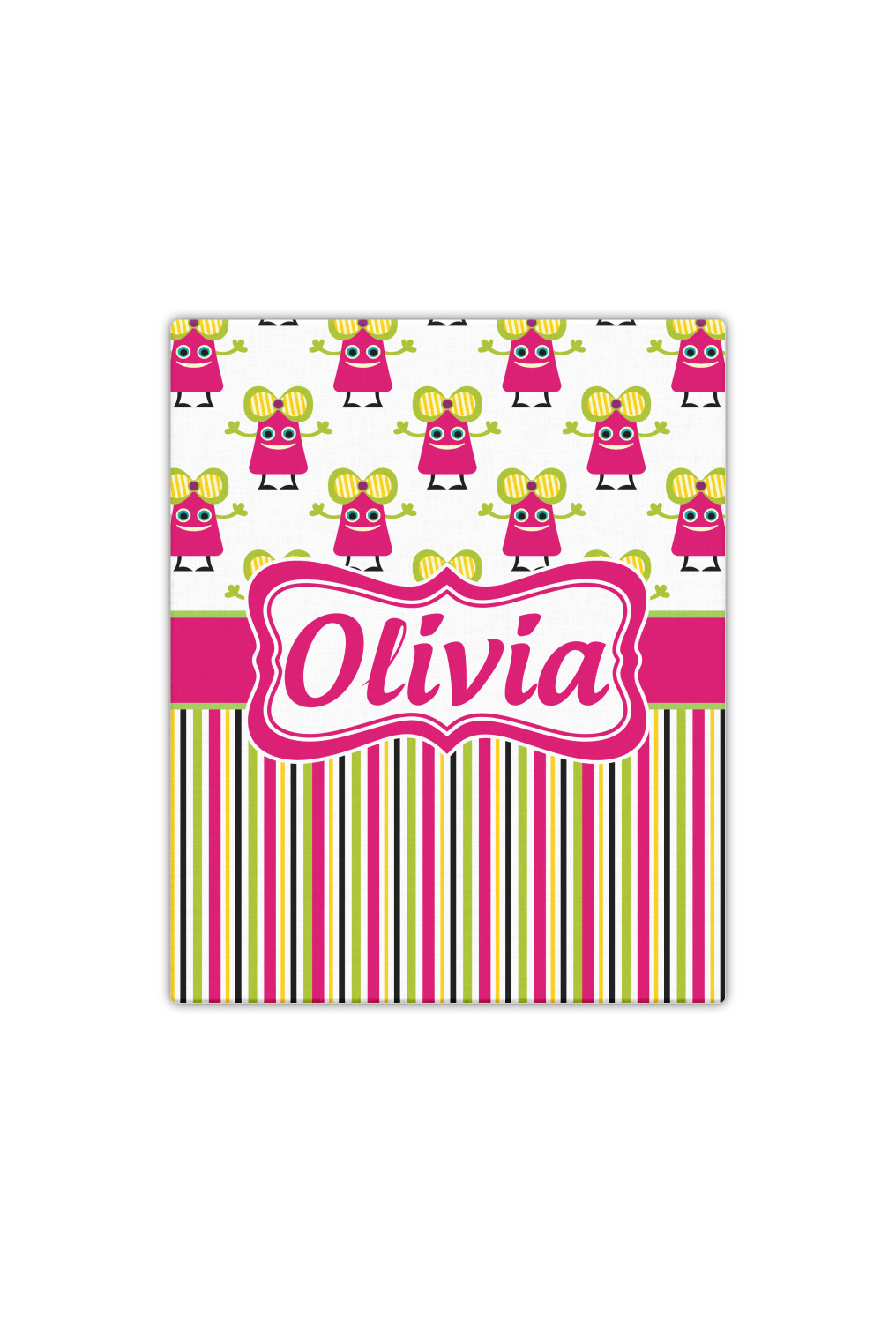 Not all little monsters have to be scary. Our one of kind girly girl monster pattern will sure to delight your little one. This little hot pink monster is decorated with a huge green, yellow, and purple bow. Set on a white background she is just begging for a hug. A classic candy striped pattern below using coordinating colors brings this design together. A wide hot pink band trimmed in lime green adds a designer touch.