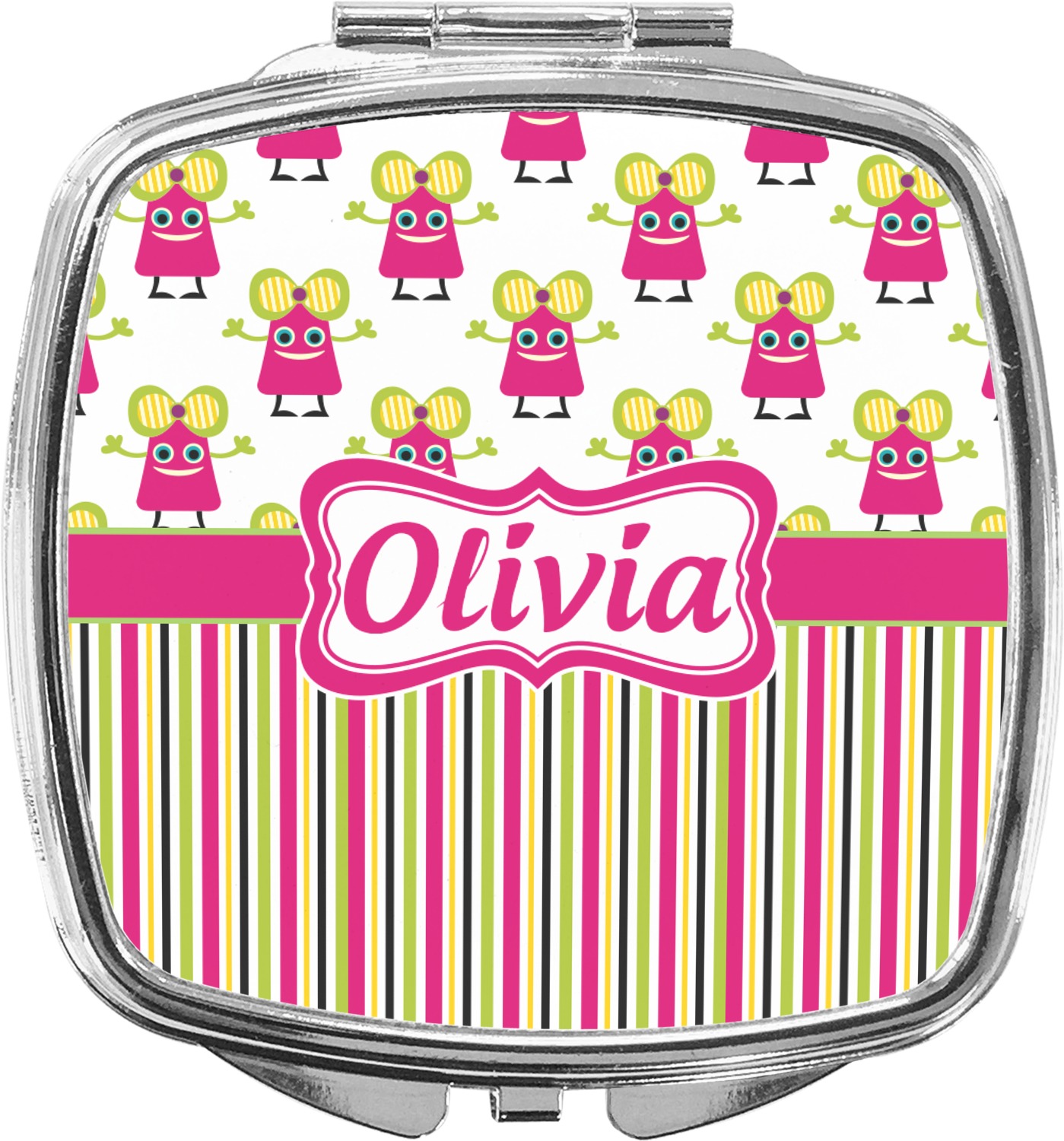We offer many prints and patterns and many of our patterns are available in 45 different colors. You can personalized the compact mirrors with a name, a monogram or just an initial. We offer several different label, ribbon and font choices. Our customization system lets you create your very own custom & unique product and it lets you preview it before you purchase.