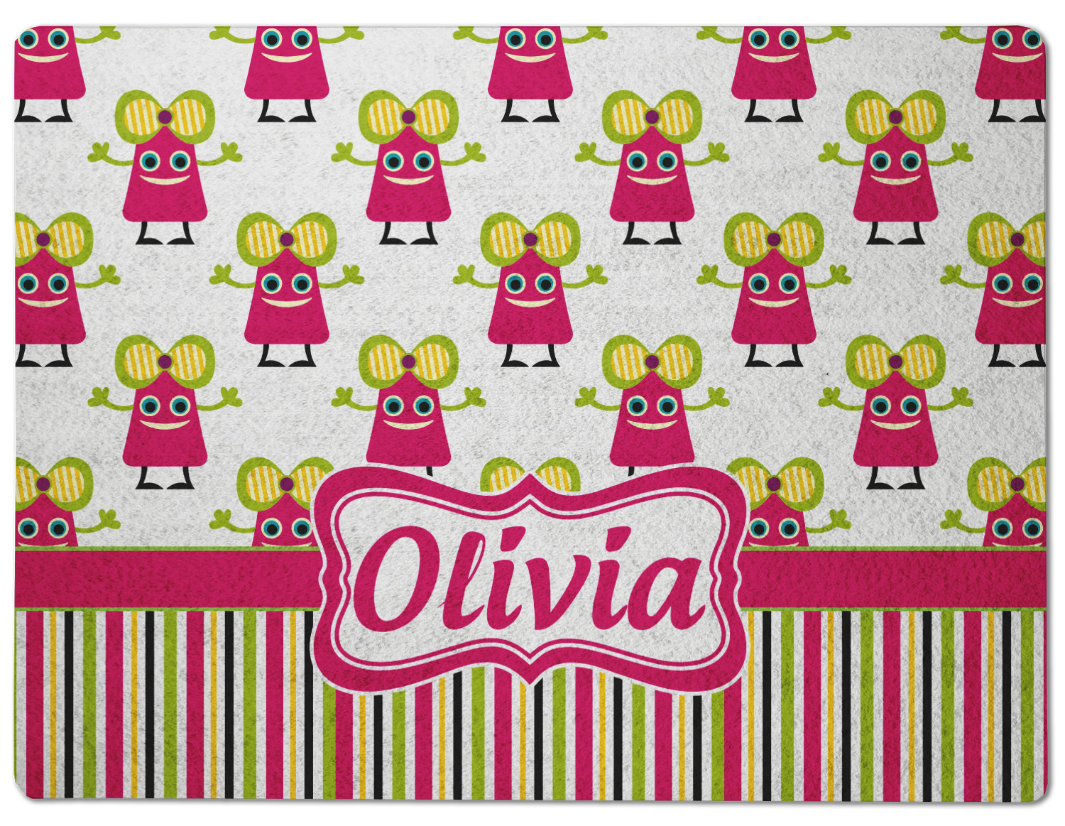 Not all little monsters have to be scary. Our one of kind girly girl monster pattern will sure to delight your little one. This little hot pink monster is decorated with a huge green, yellow, and purple bow. Set on a white background she is just begging for a hug. A classic candy striped pattern below using coordinating colors brings this design together. A wide hot pink band trimmed in lime green adds a designer touch.