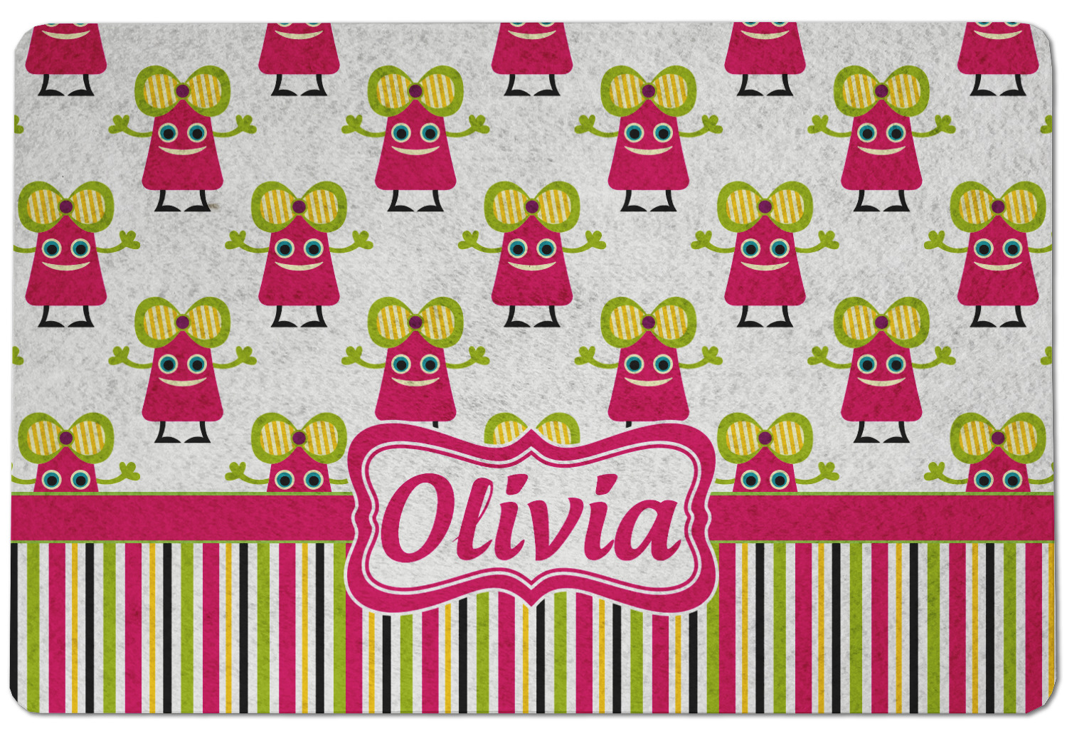 Not all little monsters have to be scary. Our one of kind girly girl monster pattern will sure to delight your little one. This little hot pink monster is decorated with a huge green, yellow, and purple bow. Set on a white background she is just begging for a hug. A classic candy striped pattern below using coordinating colors brings this design together. A wide hot pink band trimmed in lime green adds a designer touch.