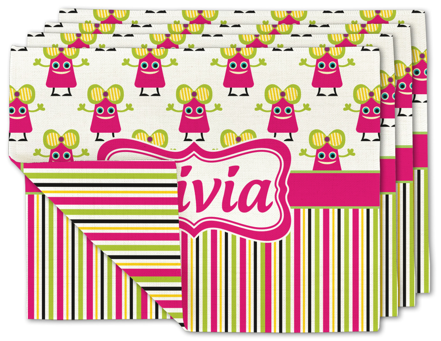 Not all little monsters have to be scary. Our one of kind girly girl monster pattern will sure to delight your little one. This little hot pink monster is decorated with a huge green, yellow, and purple bow. Set on a white background she is just begging for a hug. A classic candy striped pattern below using coordinating colors brings this design together. A wide hot pink band trimmed in lime green adds a designer touch.