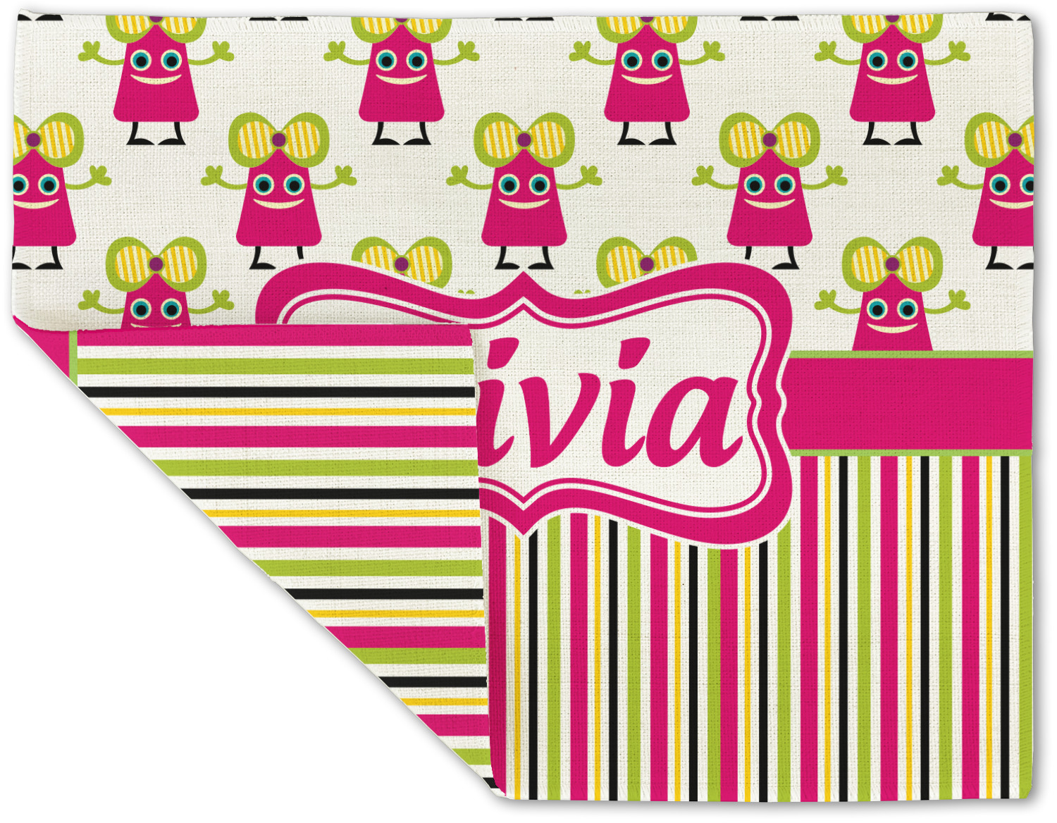 Not all little monsters have to be scary. Our one of kind girly girl monster pattern will sure to delight your little one. This little hot pink monster is decorated with a huge green, yellow, and purple bow. Set on a white background she is just begging for a hug. A classic candy striped pattern below using coordinating colors brings this design together. A wide hot pink band trimmed in lime green adds a designer touch.