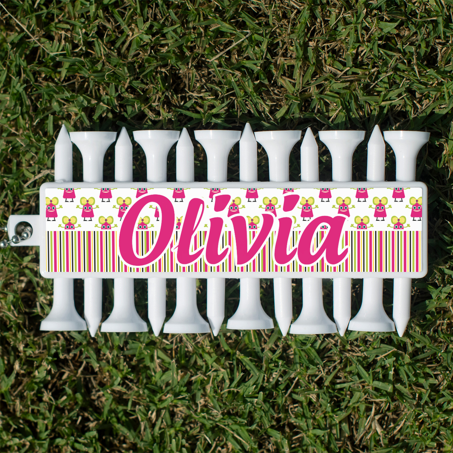 With 12 tees on a lightweight, portable key chain, it almost ensures a great 18 holes. Our tees are made of white plastic and are a little over 2". Design the front and the back of the golf tee holder. Pick from over a hundred designs, colors, and personalization styles! The set even comes with three removable ball markers as well!