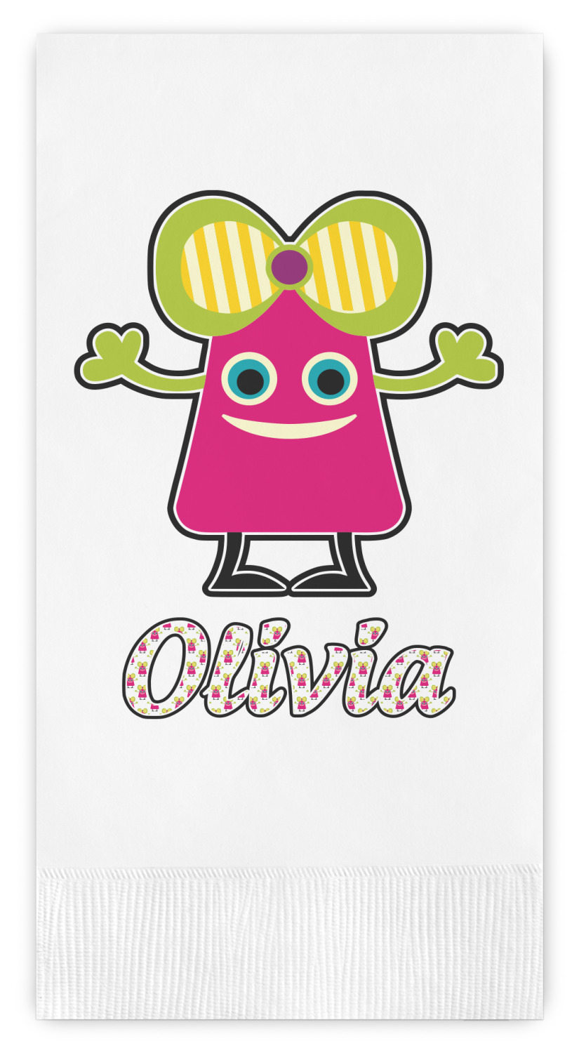 Not all little monsters have to be scary. Our one of kind girly girl monster pattern will sure to delight your little one. This little hot pink monster is decorated with a huge green, yellow, and purple bow. Set on a white background she is just begging for a hug. A classic candy striped pattern below using coordinating colors brings this design together. A wide hot pink band trimmed in lime green adds a designer touch.