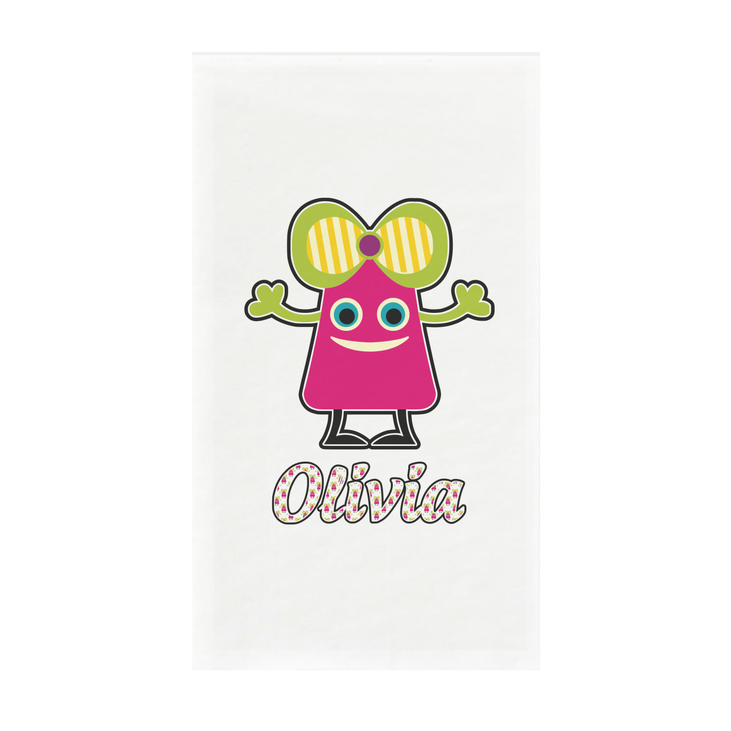 Not all little monsters have to be scary. Our one of kind girly girl monster pattern will sure to delight your little one. This little hot pink monster is decorated with a huge green, yellow, and purple bow. Set on a white background she is just begging for a hug. A classic candy striped pattern below using coordinating colors brings this design together. A wide hot pink band trimmed in lime green adds a designer touch.