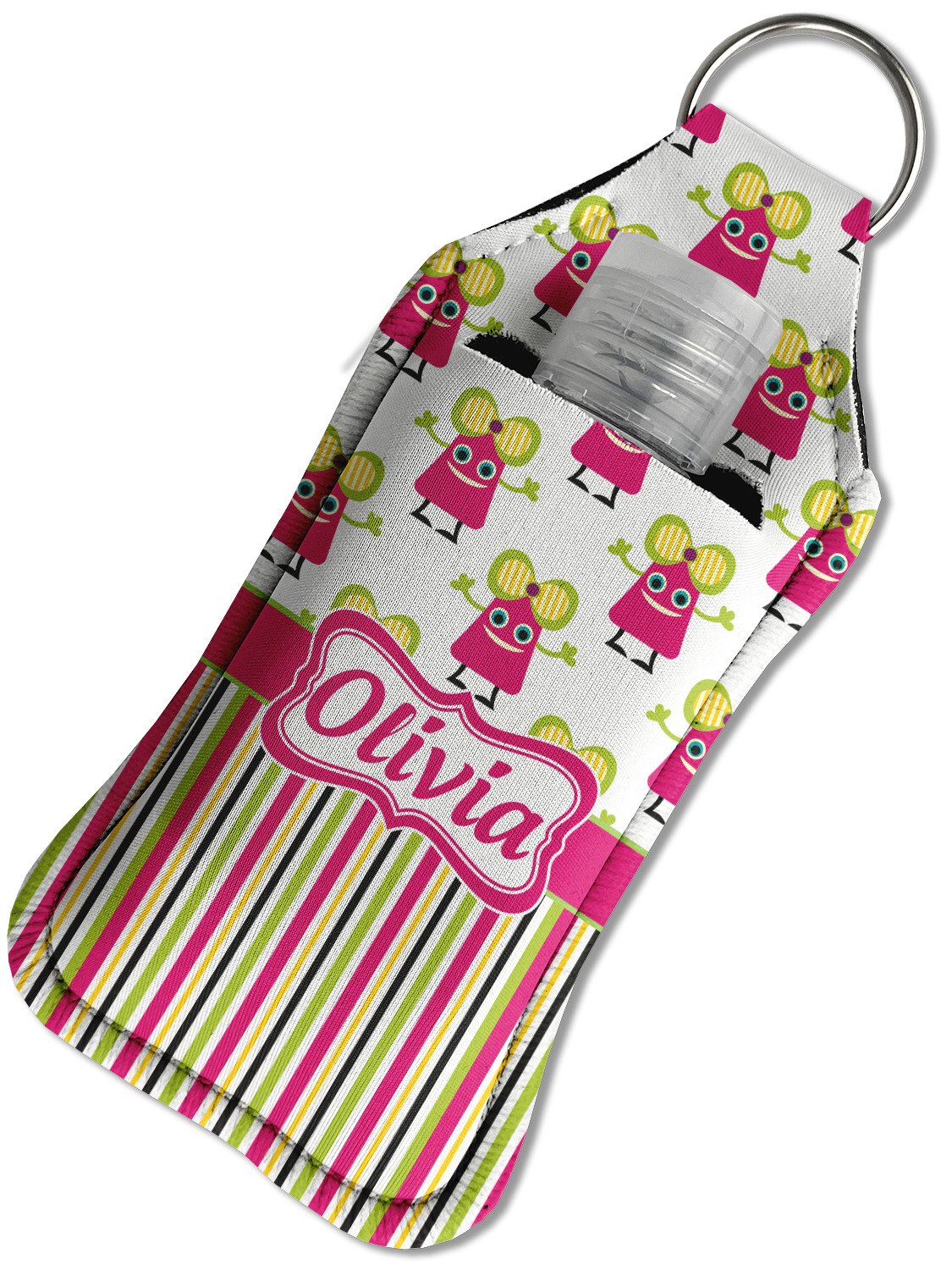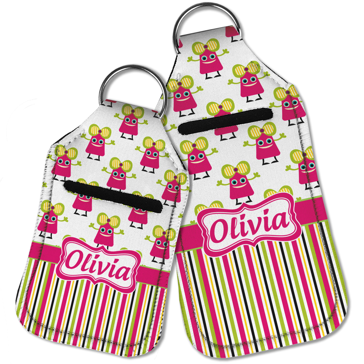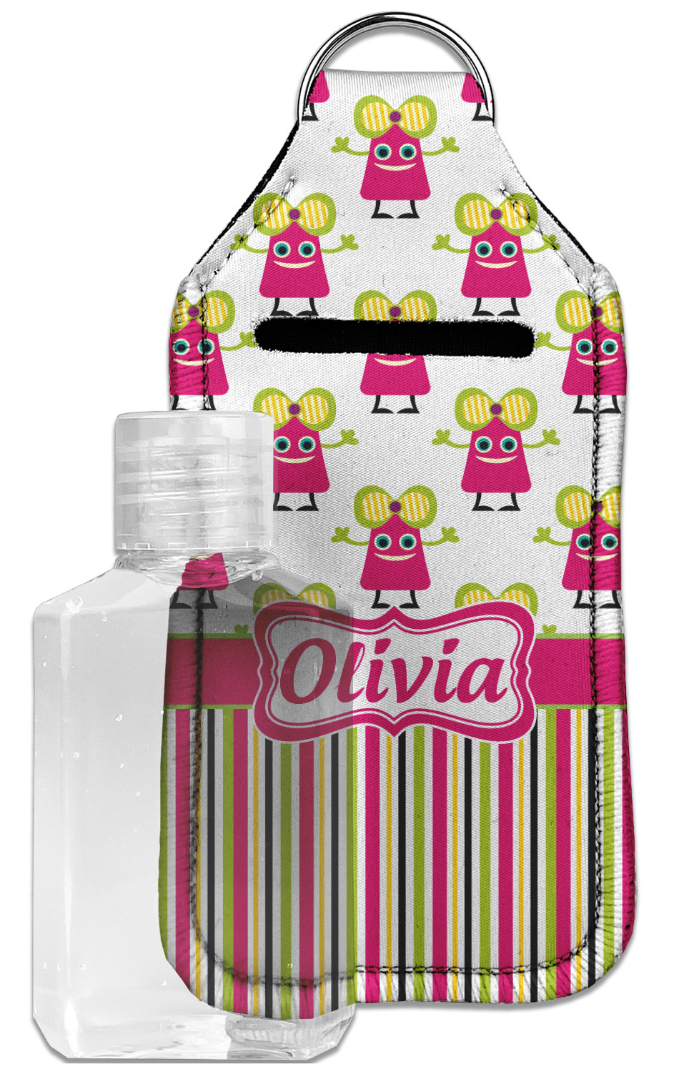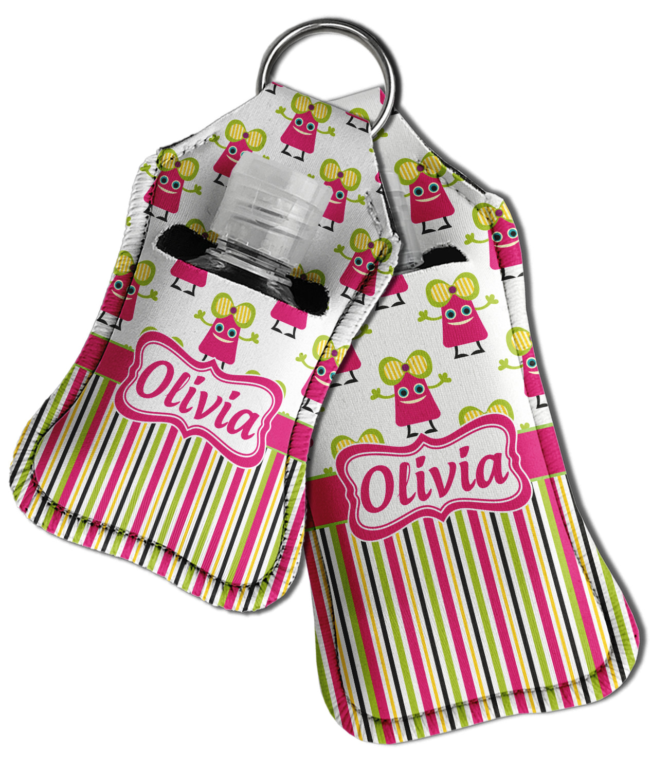 Each hand sanitizer holder comes with its own empty travel-sized, refillable hand sanitizer sure to fit snug in your customized sanitizer case! Our hand sanitizer cases are a durable, yet soft neoprene material sure to last any daily activities or travel agenda. Customize and personalize a hand sanitizer bottle holder with one of our two sizes - small (4.25" x 2.25") or large (5.5" x 2.5"). Each travel sanitizer holder comes with a keyring for attachment on bags, keys, or more!