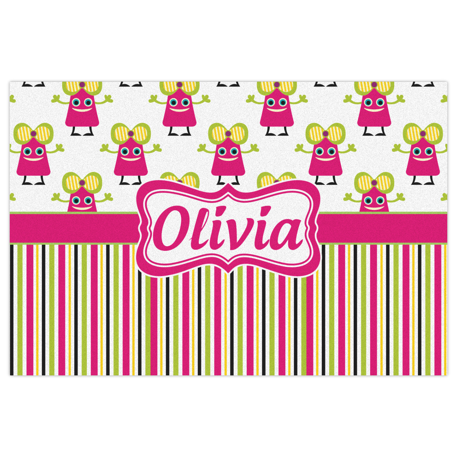Not all little monsters have to be scary. Our one of kind girly girl monster pattern will sure to delight your little one. This little hot pink monster is decorated with a huge green, yellow, and purple bow. Set on a white background she is just begging for a hug. A classic candy striped pattern below using coordinating colors brings this design together. A wide hot pink band trimmed in lime green adds a designer touch.