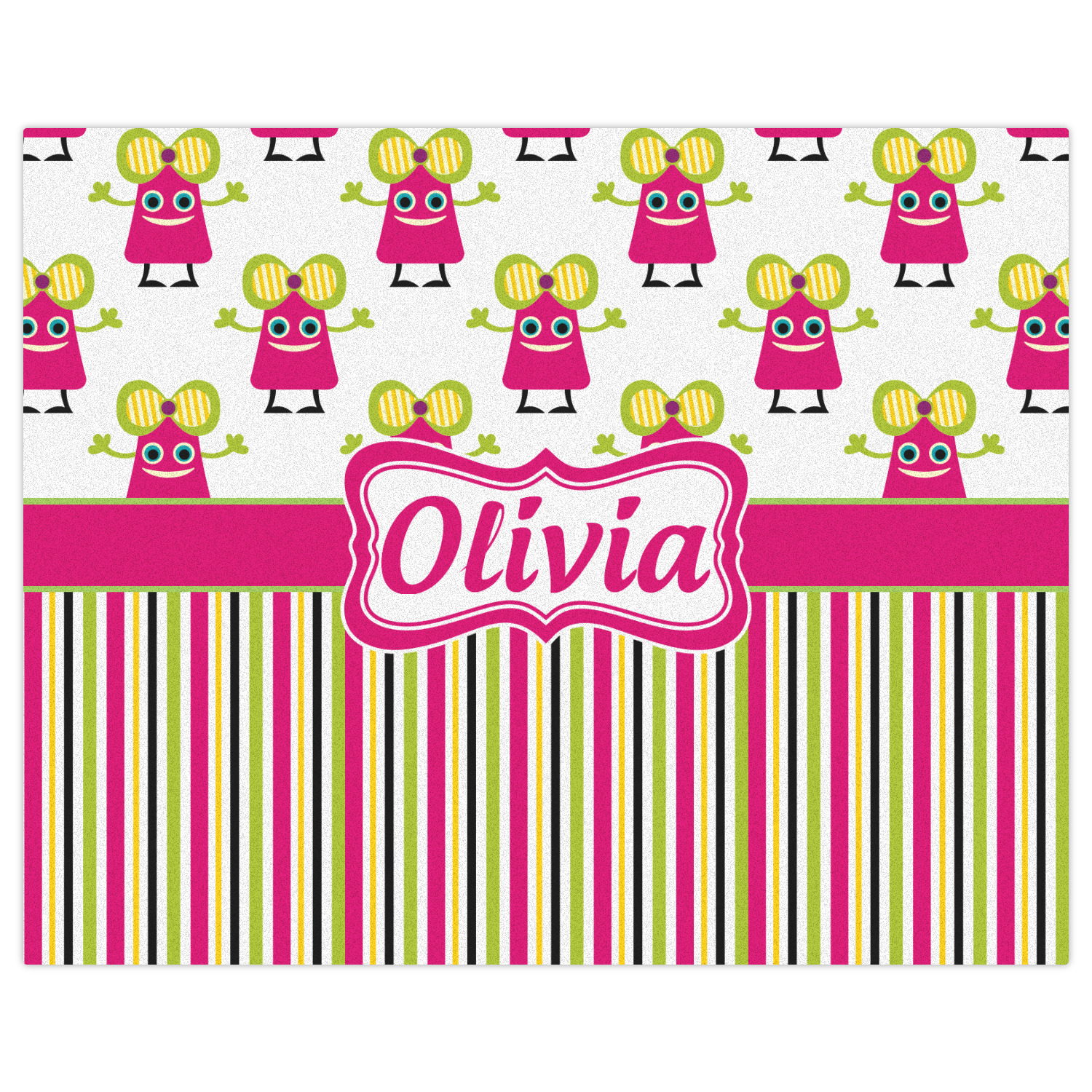 Not all little monsters have to be scary. Our one of kind girly girl monster pattern will sure to delight your little one. This little hot pink monster is decorated with a huge green, yellow, and purple bow. Set on a white background she is just begging for a hug. A classic candy striped pattern below using coordinating colors brings this design together. A wide hot pink band trimmed in lime green adds a designer touch.