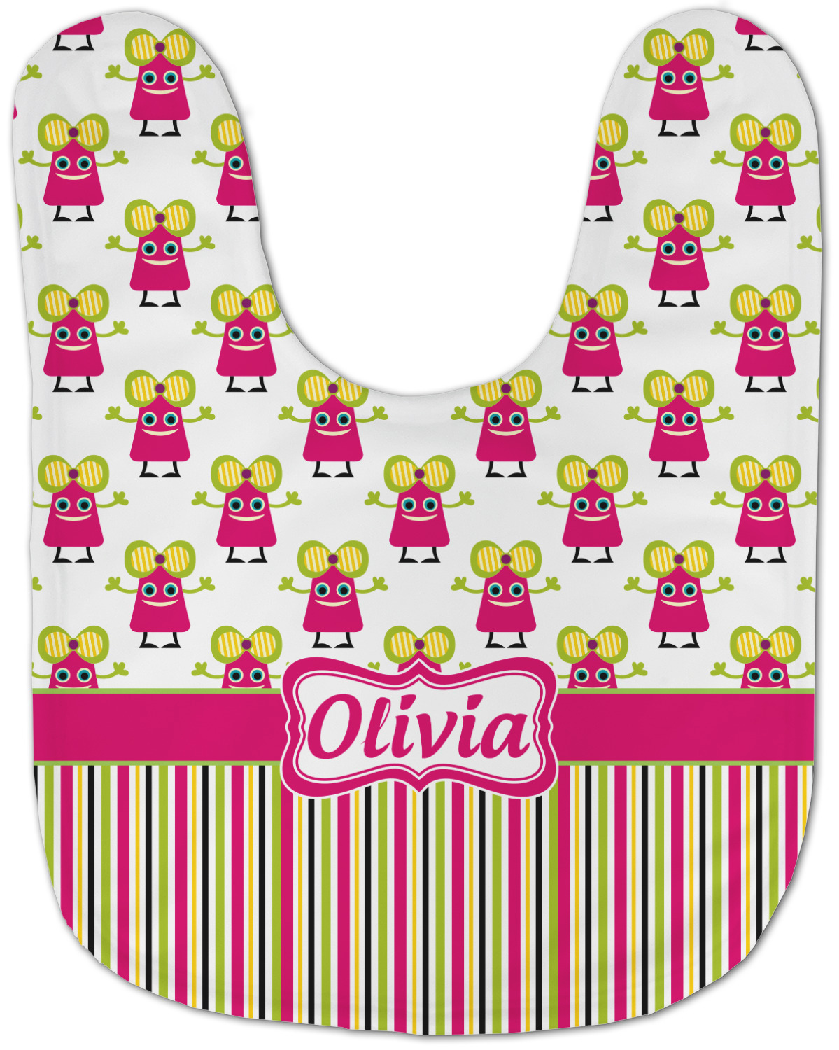 Made of soft polyester, each customizable bib hugs comfortably around the neck to catch every drip and drool. Each bib design is printed with baby-safe ink and finished with a secure stitch pattern and velcro clasp. We carry two customizable bib styles -Microfiber Velour and Jersey Knit.