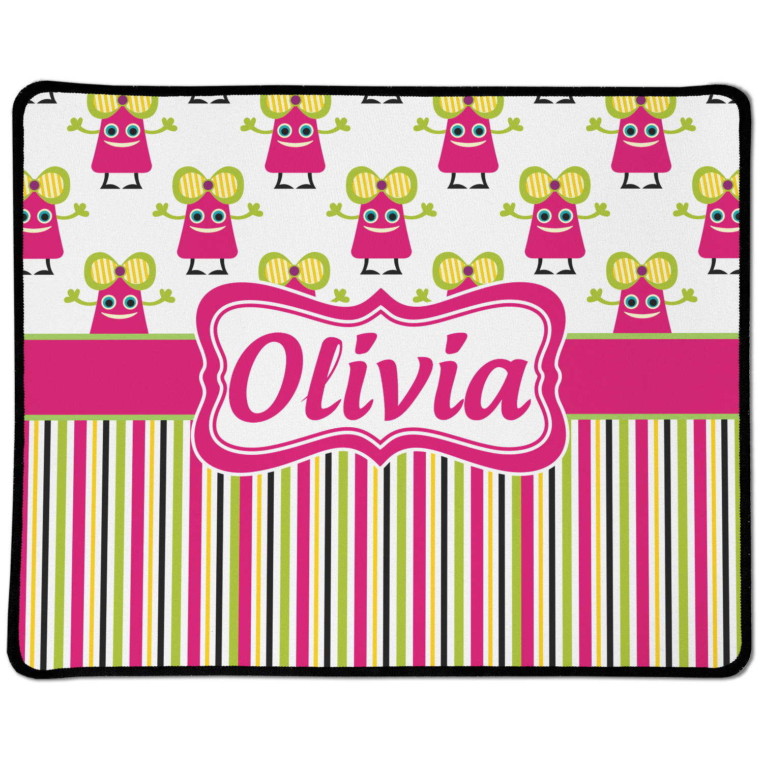 Not all little monsters have to be scary. Our one of kind girly girl monster pattern will sure to delight your little one. This little hot pink monster is decorated with a huge green, yellow, and purple bow. Set on a white background she is just begging for a hug. A classic candy striped pattern below using coordinating colors brings this design together. A wide hot pink band trimmed in lime green adds a designer touch.