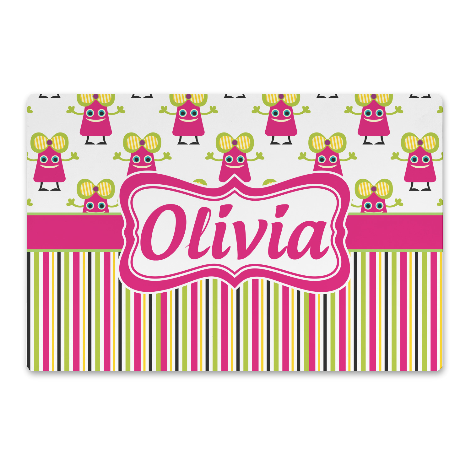 Not all little monsters have to be scary. Our one of kind girly girl monster pattern will sure to delight your little one. This little hot pink monster is decorated with a huge green, yellow, and purple bow. Set on a white background she is just begging for a hug. A classic candy striped pattern below using coordinating colors brings this design together. A wide hot pink band trimmed in lime green adds a designer touch.