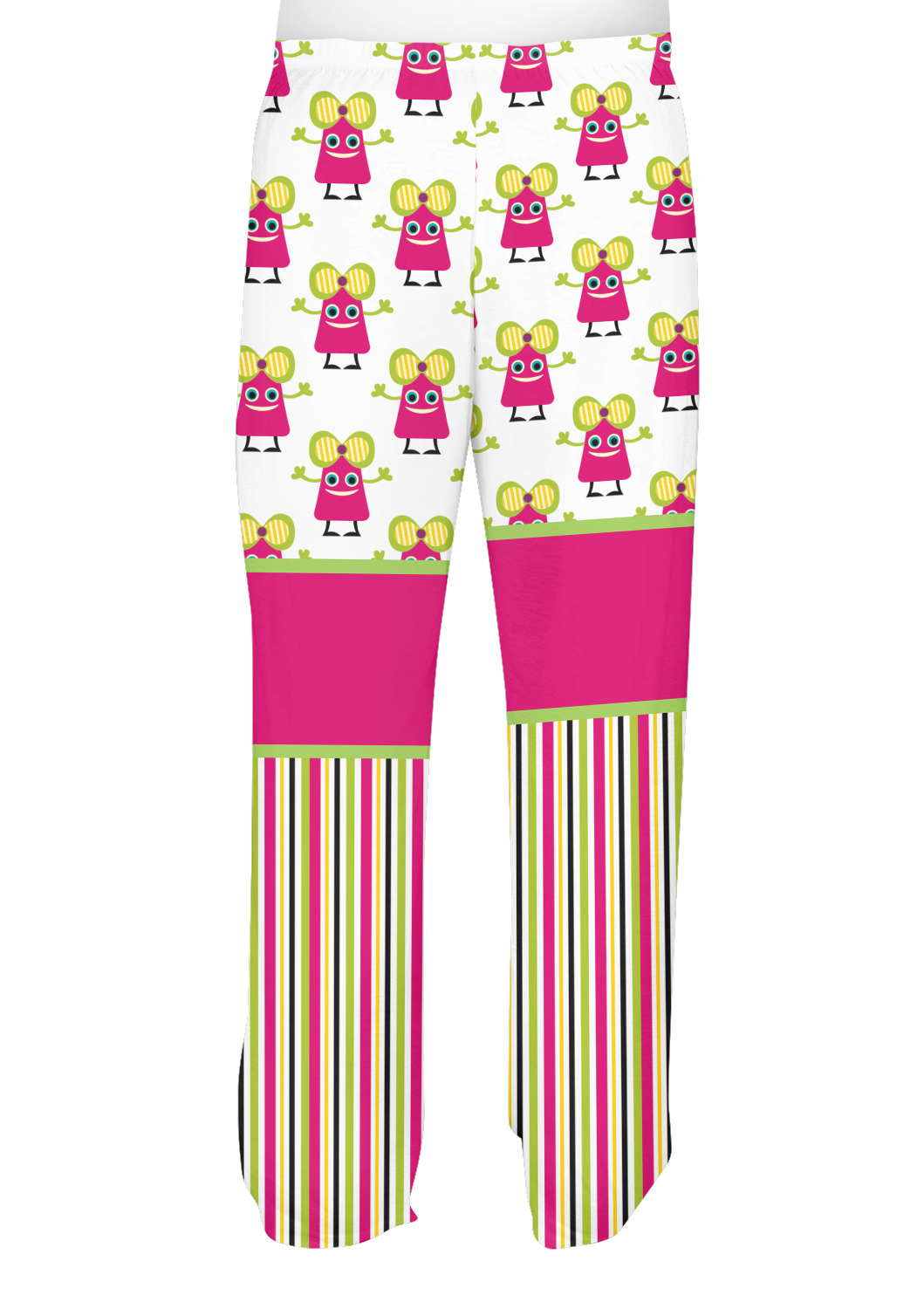 Not all little monsters have to be scary. Our one of kind girly girl monster pattern will sure to delight your little one. This little hot pink monster is decorated with a huge green, yellow, and purple bow. Set on a white background she is just begging for a hug. A classic candy striped pattern below using coordinating colors brings this design together. A wide hot pink band trimmed in lime green adds a designer touch.