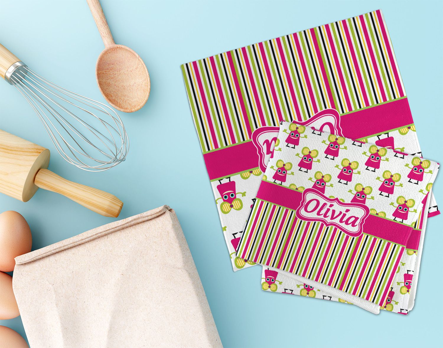 Not all little monsters have to be scary. Our one of kind girly girl monster pattern will sure to delight your little one. This little hot pink monster is decorated with a huge green, yellow, and purple bow. Set on a white background she is just begging for a hug. A classic candy striped pattern below using coordinating colors brings this design together. A wide hot pink band trimmed in lime green adds a designer touch.