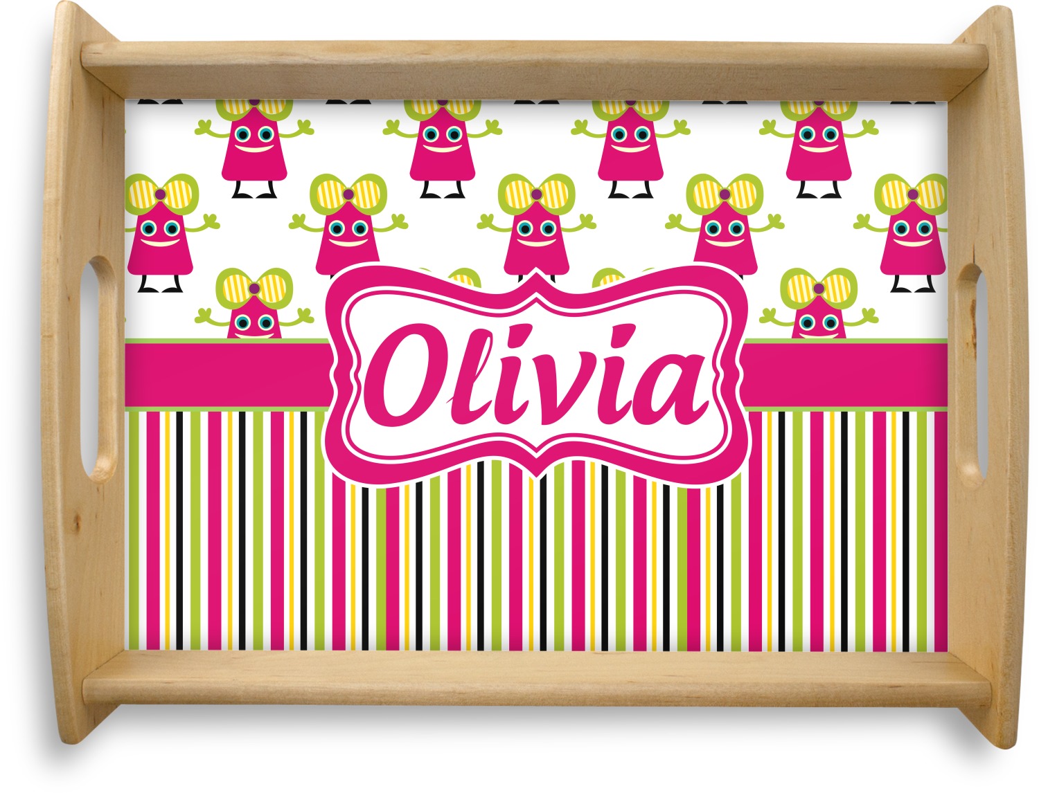 This serving tray with handles features square edges and two rounded sides, creating a very modern look. Each side is fabricated from a beautifully cut, natural wood. The bottom of the interior of the tray displays your customized design in bright, vibrant color. The tray is sold in both a black color and a natural wood look. Each variation of the wood serving tray has two sizes: Small, which is 14" x 10" x 2.25", and Large, which is 19.5" x 13.5" x 2.75".