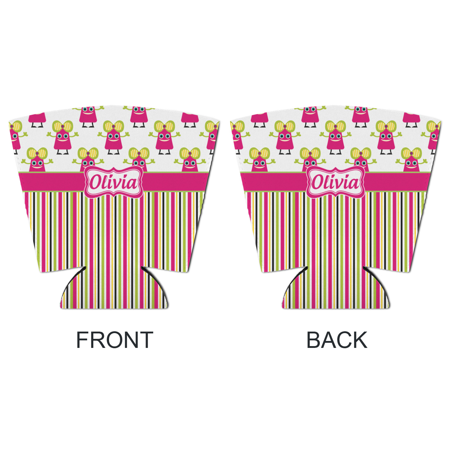 Not all little monsters have to be scary. Our one of kind girly girl monster pattern will sure to delight your little one. This little hot pink monster is decorated with a huge green, yellow, and purple bow. Set on a white background she is just begging for a hug. A classic candy striped pattern below using coordinating colors brings this design together. A wide hot pink band trimmed in lime green adds a designer touch.