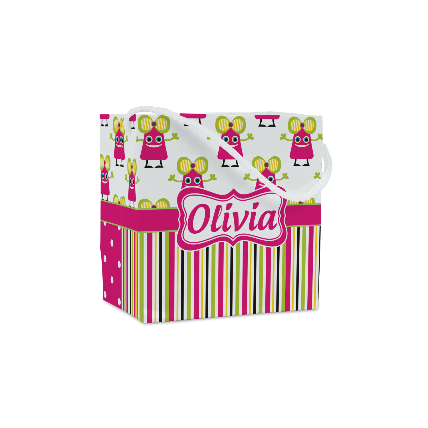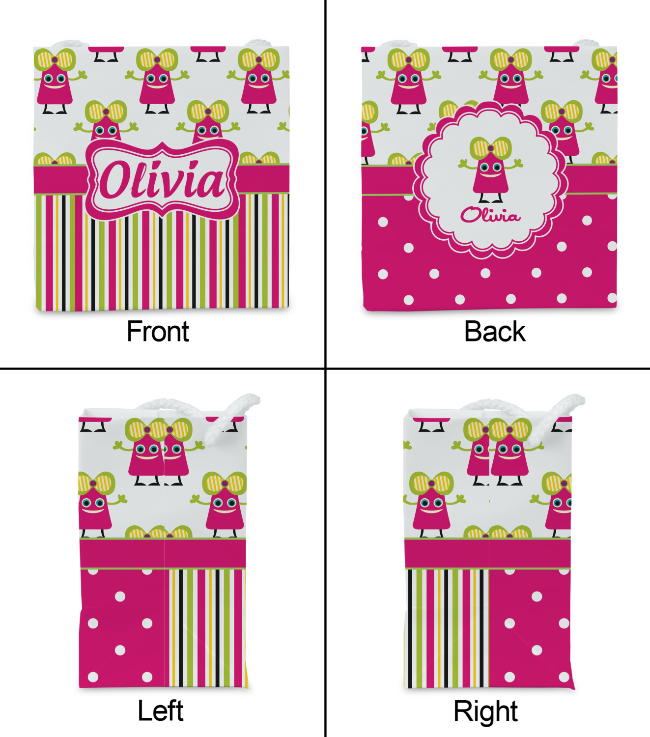 Not all little monsters have to be scary. Our one of kind girly girl monster pattern will sure to delight your little one. This little hot pink monster is decorated with a huge green, yellow, and purple bow. Set on a white background she is just begging for a hug. A classic candy striped pattern below using coordinating colors brings this design together. A wide hot pink band trimmed in lime green adds a designer touch.