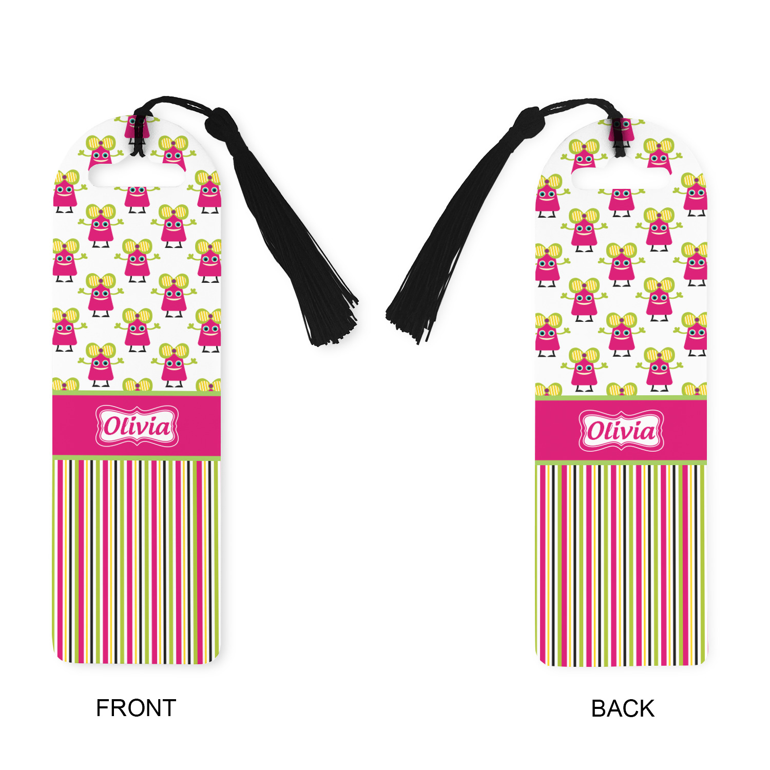 Made from a durable, flexible plastic, these bookmarks are printed with your custom design on them. With the tassel on them they make it easy to find your page in your book. These are a rectangular shape 7 1/4 inches tall with a rounded top and are approximately 2 1/4 inches wide.