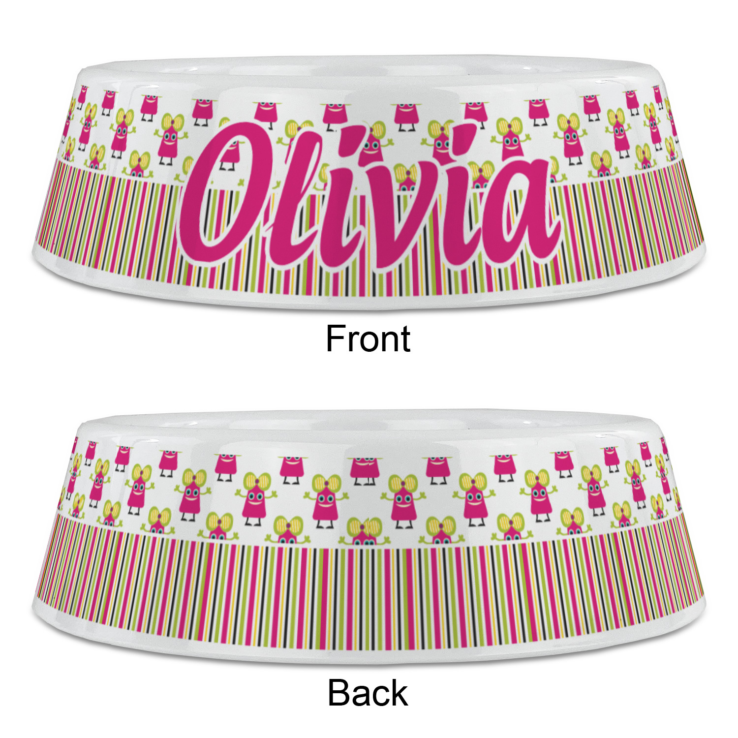 Not all little monsters have to be scary. Our one of kind girly girl monster pattern will sure to delight your little one. This little hot pink monster is decorated with a huge green, yellow, and purple bow. Set on a white background she is just begging for a hug. A classic candy striped pattern below using coordinating colors brings this design together. A wide hot pink band trimmed in lime green adds a designer touch.
