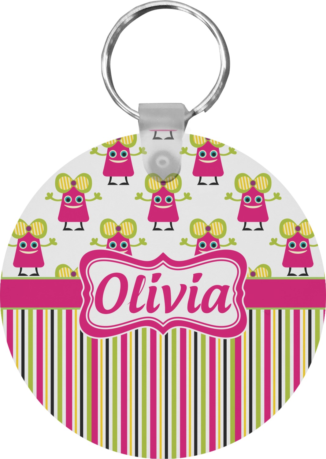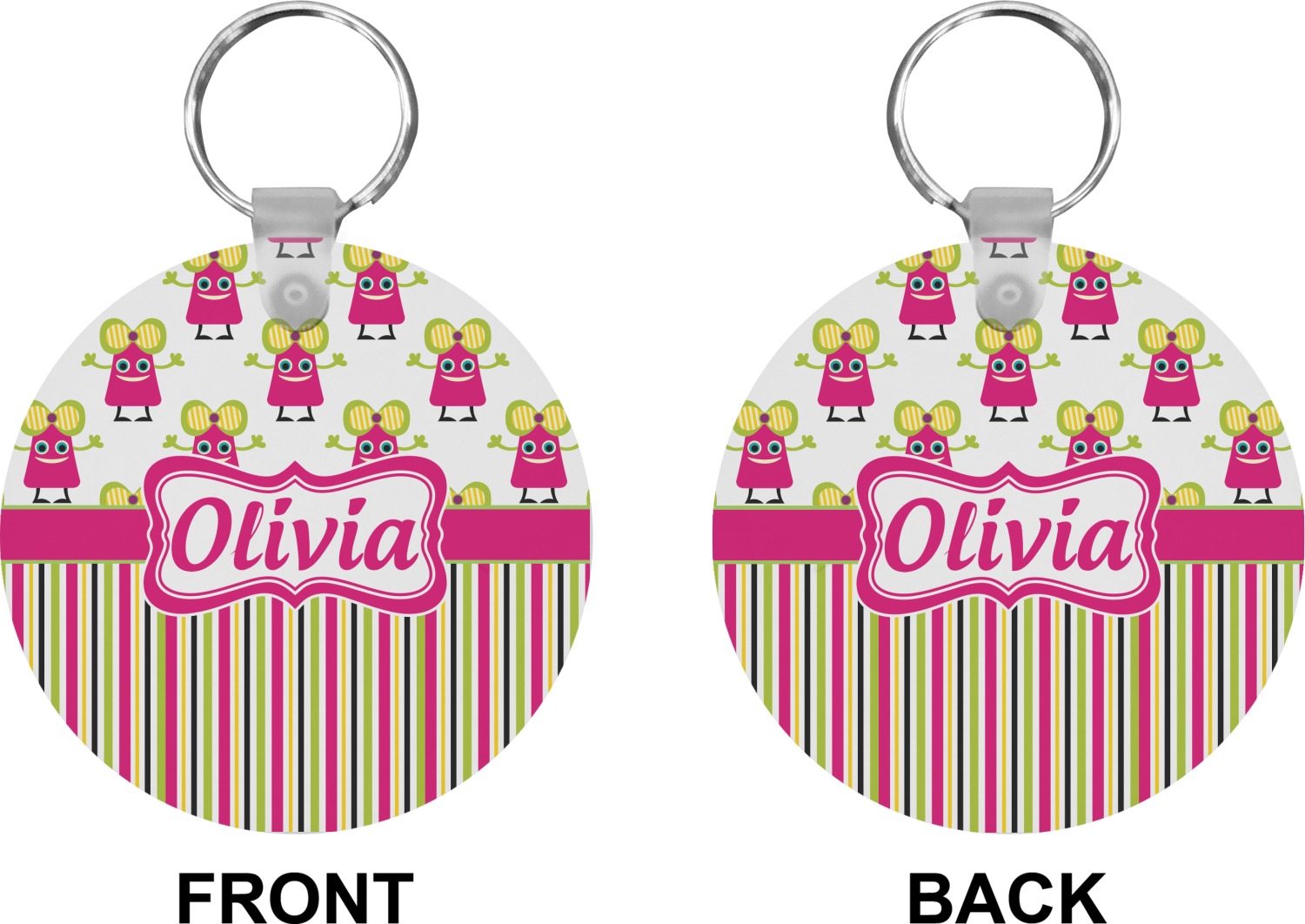 Our personalized keychains attach to the included metal, split key ring with a plastic, removable snap. Since a metal ring is included with your purchase, you have the liberty to keep your keys together on the ring, with or without your unique keychain. We offer this keychain in three different shapes: circle, heart, or diamond. We print your personalized design(s) on both sides of the key chain, and the surface has a glossy, reflective finish that only emphasizes your design. Each keychain is approximately 2.25 by 2.25 inches.