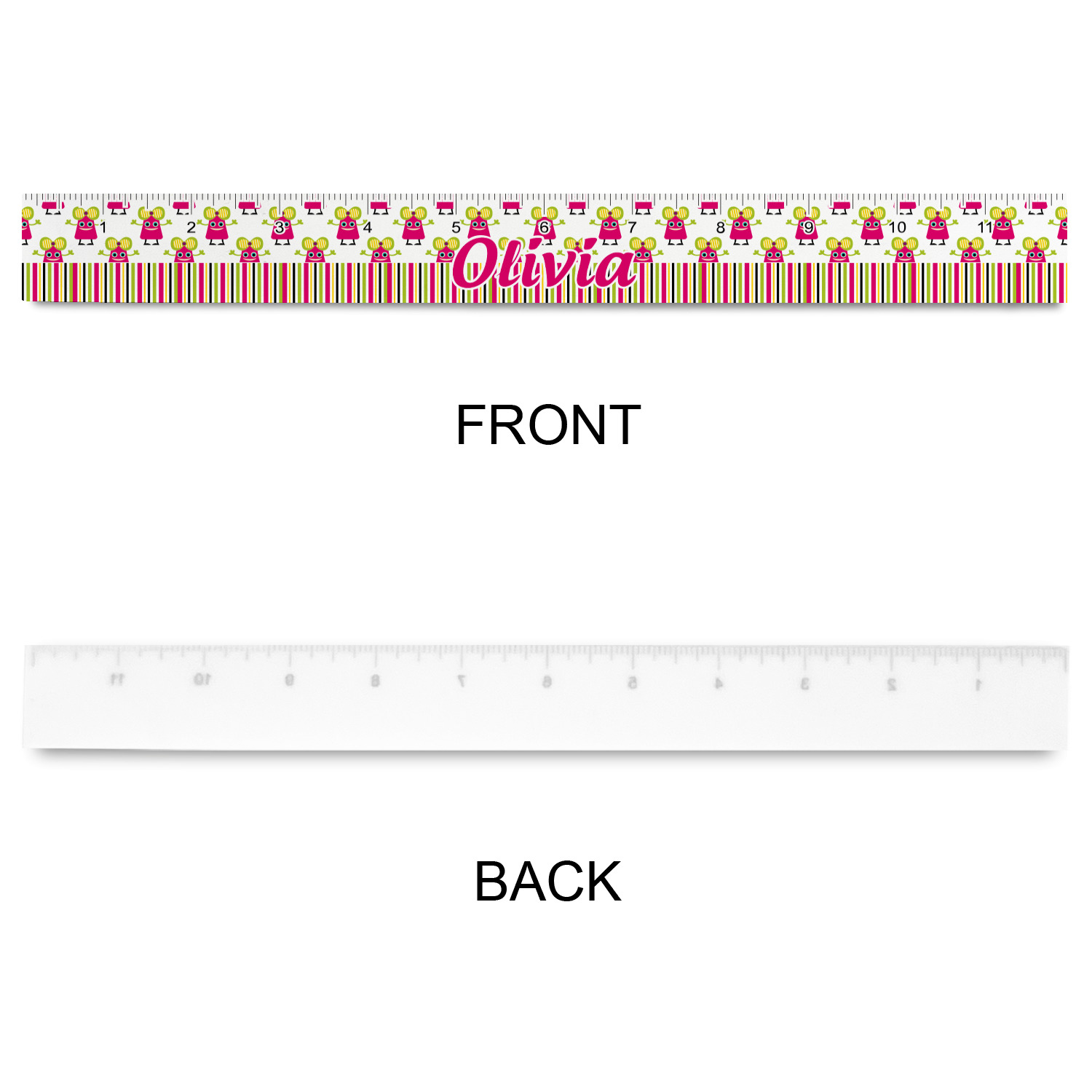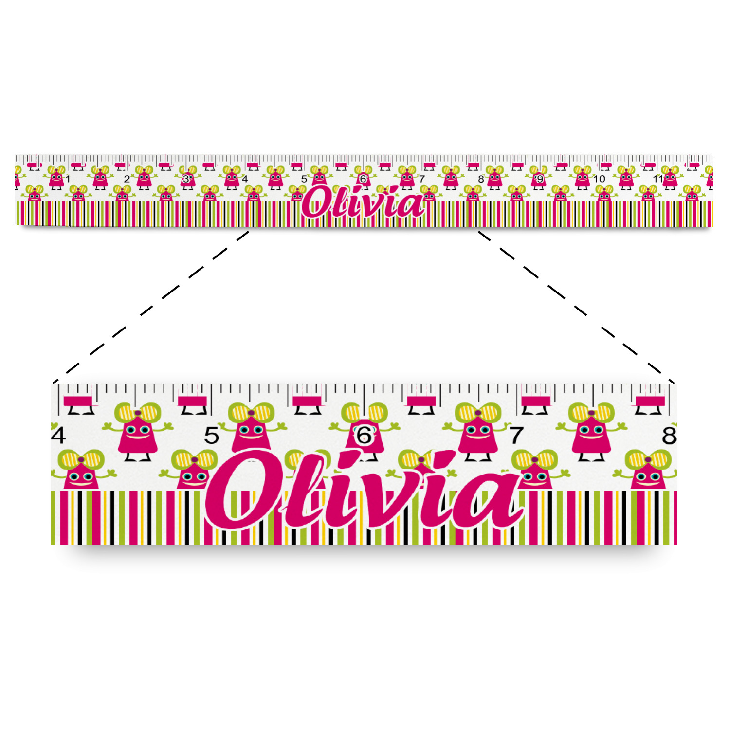 Not all little monsters have to be scary. Our one of kind girly girl monster pattern will sure to delight your little one. This little hot pink monster is decorated with a huge green, yellow, and purple bow. Set on a white background she is just begging for a hug. A classic candy striped pattern below using coordinating colors brings this design together. A wide hot pink band trimmed in lime green adds a designer touch.