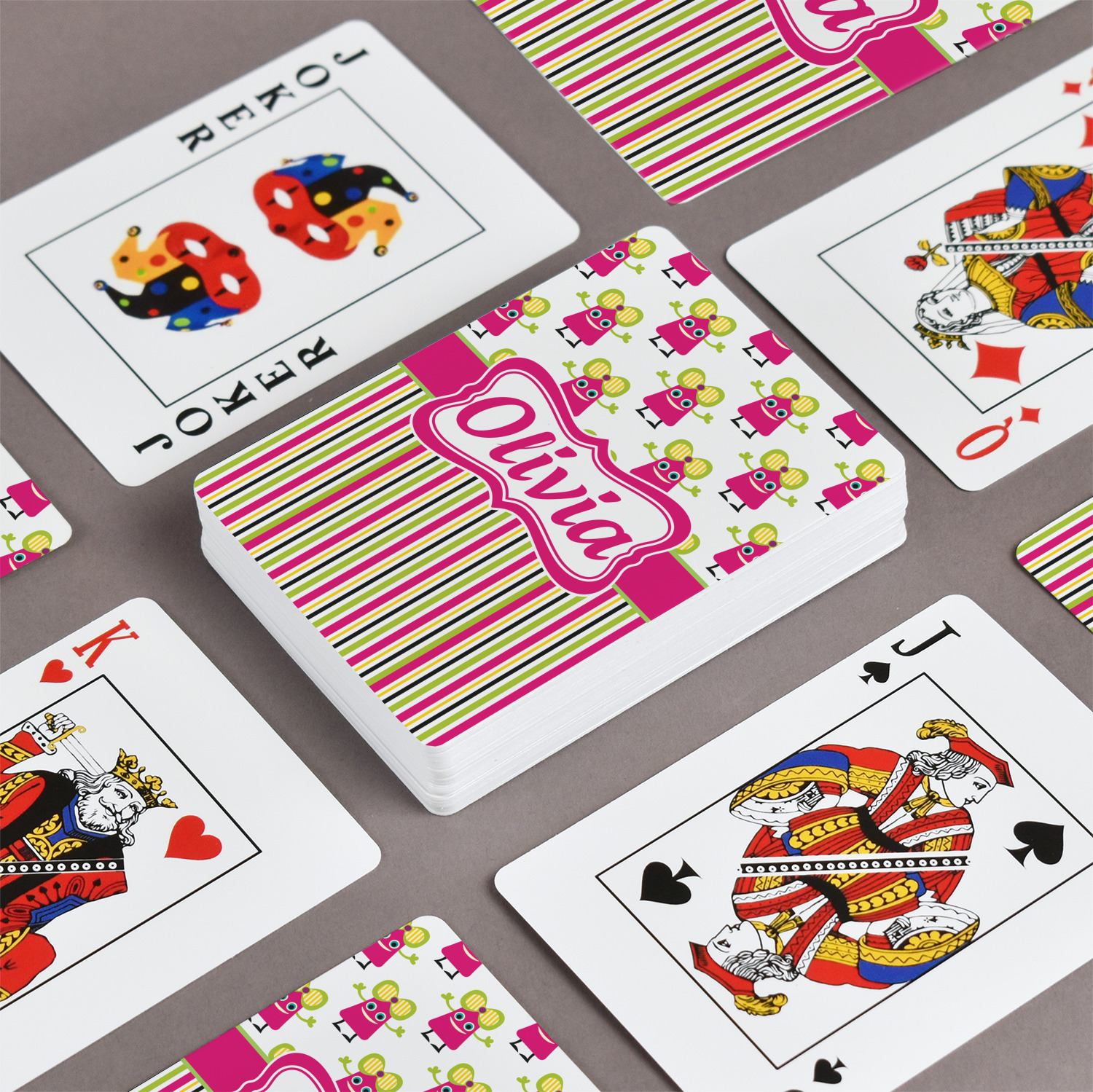 Our playing cards are perfect for family game nights or poker nights. A deck of customized playing cards ups the level of fun & entertainment to your game or poker nights. Imagine playing cards customized to match the theme of your game room, or game night, or that special event, or occasion with gambling tables!