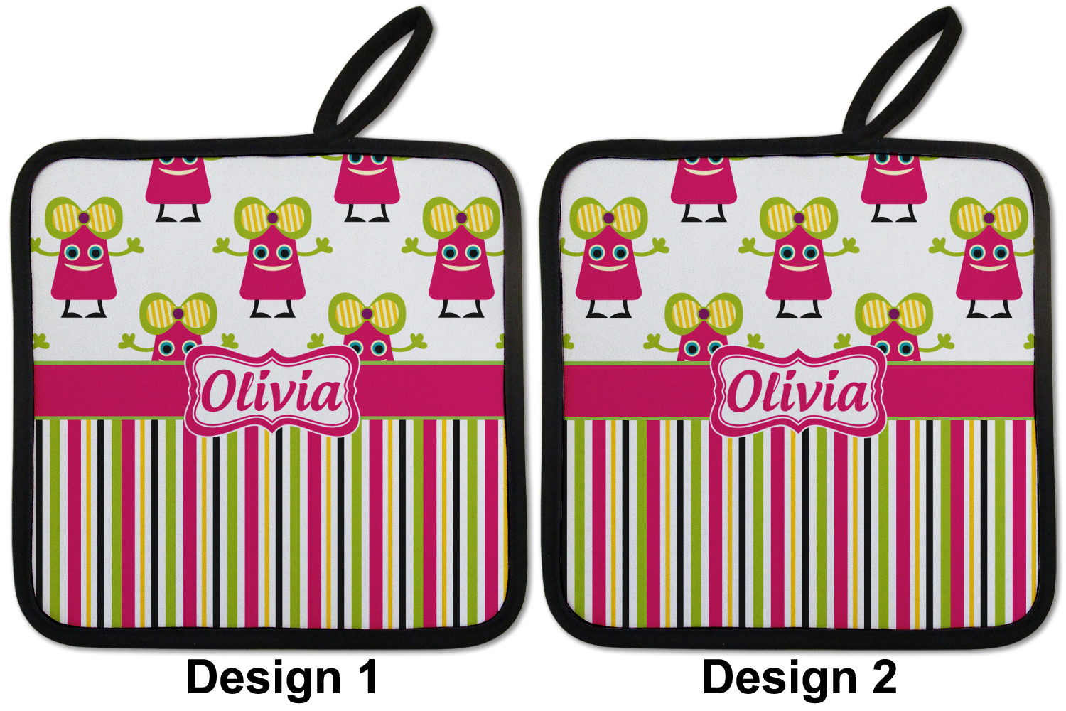 Our personalized pot holders feature a neoprene front that displays your personalization in vibrant colors. The backing of the hot pot holder is rubberized; the textured backing allows you to have a great grip when using this custom pot holder. The two materials are joined with a sleek, black trim, and the holder also includes an attached loop for hanging and storage. The pot holder is approximately 8.75 inches by 8.75 inches and 0.25 inches tall, while the fabric loop is 2.5 inches long. You can purchase a kitchen pot holder by itself or as a set of 2. We also offer a set including one pot holder and one oven mitt.
