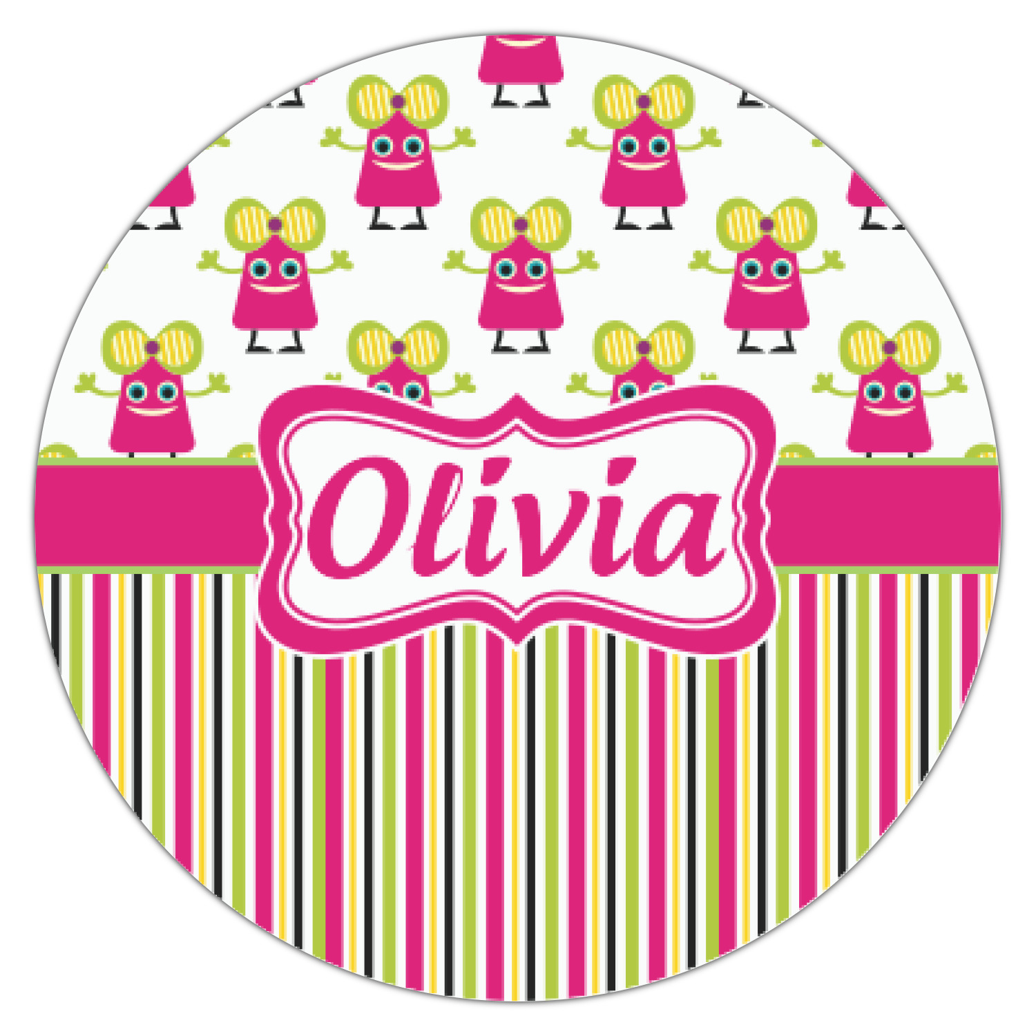 Not all little monsters have to be scary. Our one of kind girly girl monster pattern will sure to delight your little one. This little hot pink monster is decorated with a huge green, yellow, and purple bow. Set on a white background she is just begging for a hug. A classic candy striped pattern below using coordinating colors brings this design together. A wide hot pink band trimmed in lime green adds a designer touch.