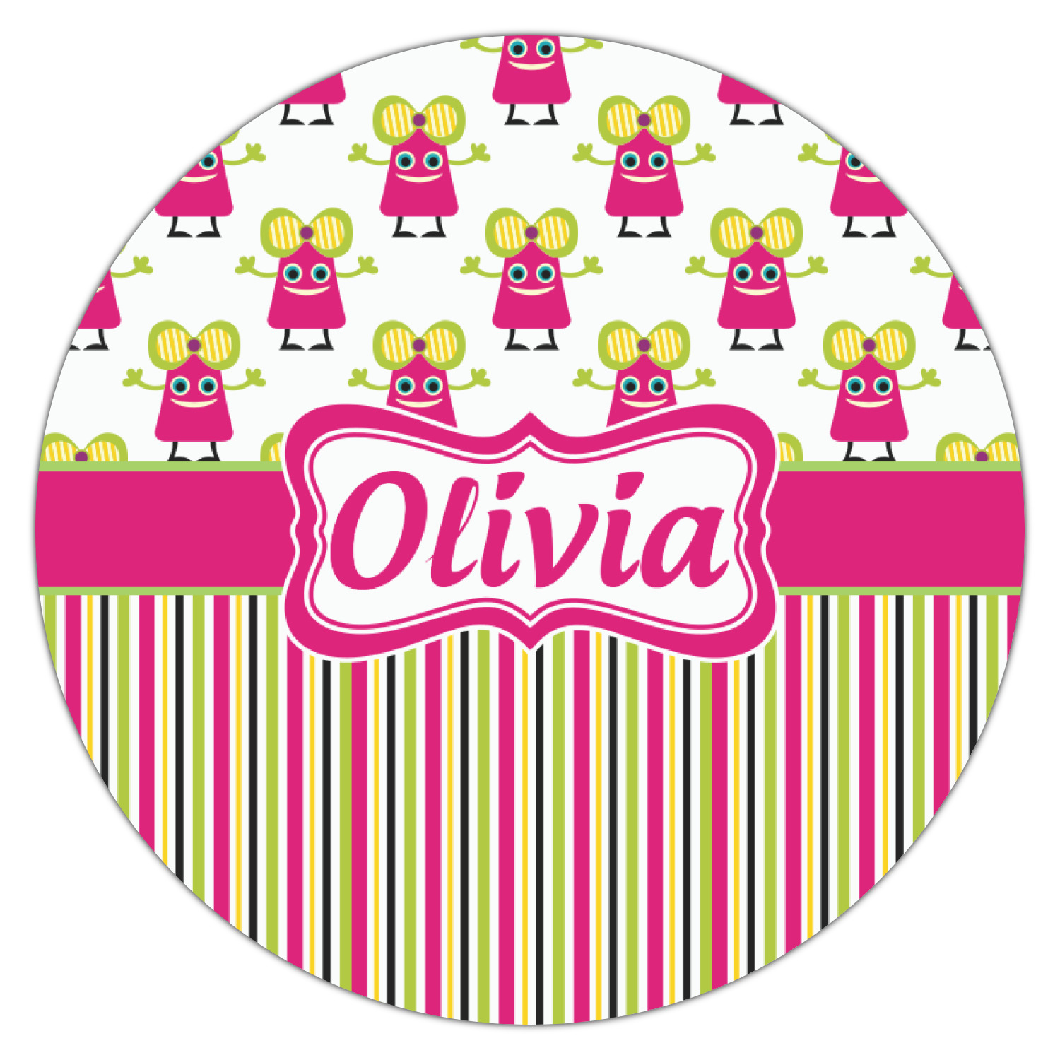 Not all little monsters have to be scary. Our one of kind girly girl monster pattern will sure to delight your little one. This little hot pink monster is decorated with a huge green, yellow, and purple bow. Set on a white background she is just begging for a hug. A classic candy striped pattern below using coordinating colors brings this design together. A wide hot pink band trimmed in lime green adds a designer touch.