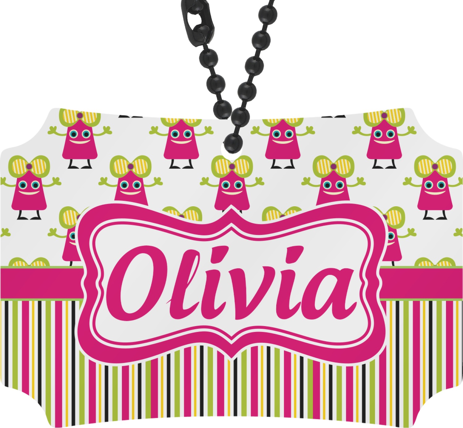 Not all little monsters have to be scary. Our one of kind girly girl monster pattern will sure to delight your little one. This little hot pink monster is decorated with a huge green, yellow, and purple bow. Set on a white background she is just begging for a hug. A classic candy striped pattern below using coordinating colors brings this design together. A wide hot pink band trimmed in lime green adds a designer touch.