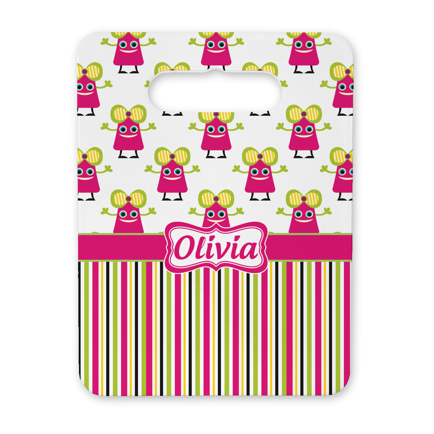 Not all little monsters have to be scary. Our one of kind girly girl monster pattern will sure to delight your little one. This little hot pink monster is decorated with a huge green, yellow, and purple bow. Set on a white background she is just begging for a hug. A classic candy striped pattern below using coordinating colors brings this design together. A wide hot pink band trimmed in lime green adds a designer touch.