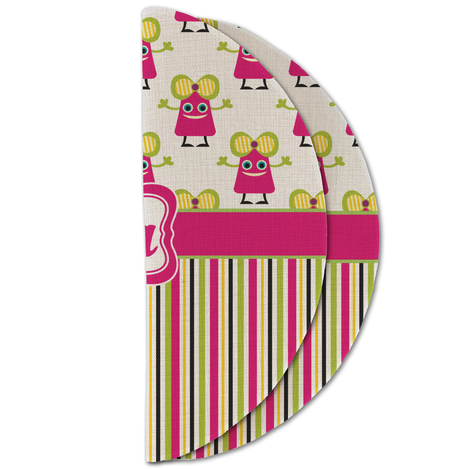 Not all little monsters have to be scary. Our one of kind girly girl monster pattern will sure to delight your little one. This little hot pink monster is decorated with a huge green, yellow, and purple bow. Set on a white background she is just begging for a hug. A classic candy striped pattern below using coordinating colors brings this design together. A wide hot pink band trimmed in lime green adds a designer touch.