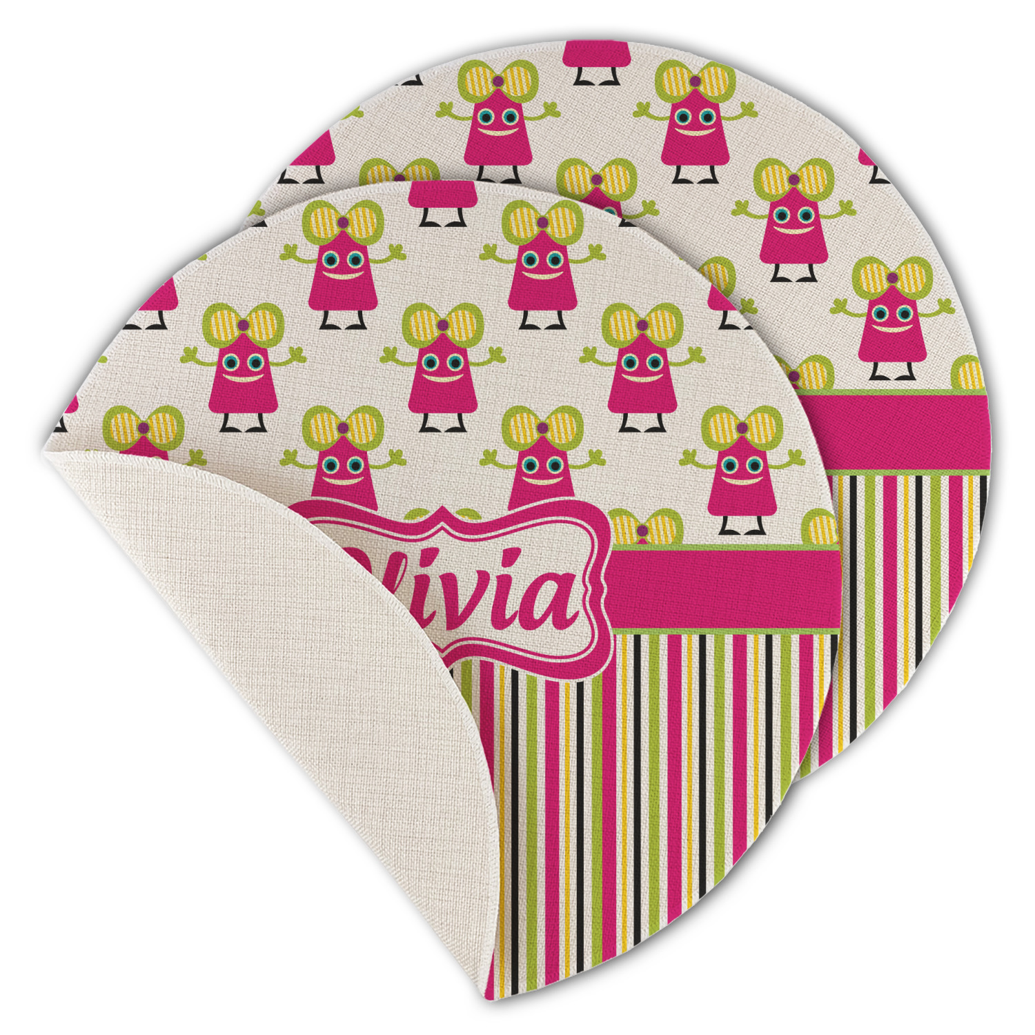 Not all little monsters have to be scary. Our one of kind girly girl monster pattern will sure to delight your little one. This little hot pink monster is decorated with a huge green, yellow, and purple bow. Set on a white background she is just begging for a hug. A classic candy striped pattern below using coordinating colors brings this design together. A wide hot pink band trimmed in lime green adds a designer touch.