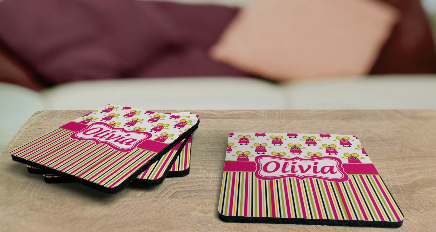 Replace your boring, run-of-the-mill coasters with a set of 4 personalized coasters! When personalized, these coasters will protect your beloved surfaces while adding to your home's decor! Thanks to your coasters bright colors and unique design, your guests will be eager to use them!