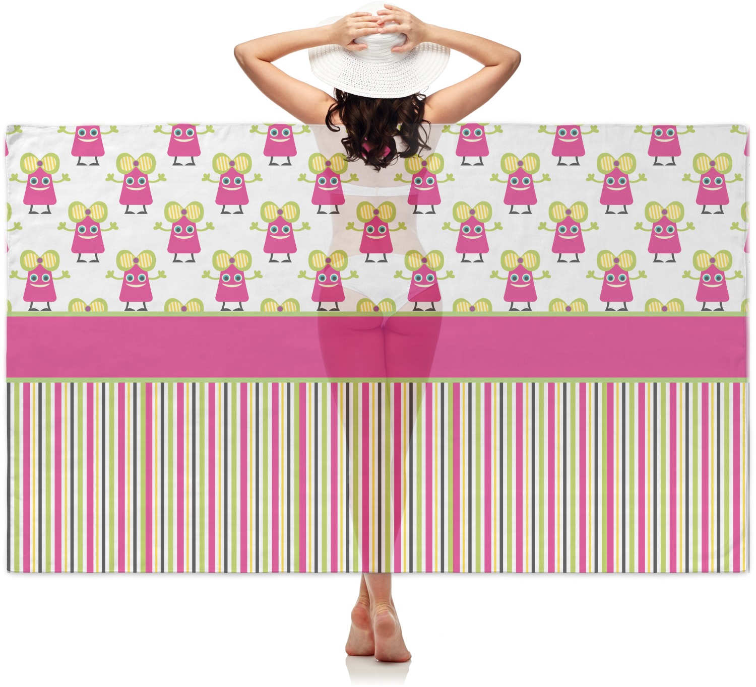 Not all little monsters have to be scary. Our one of kind girly girl monster pattern will sure to delight your little one. This little hot pink monster is decorated with a huge green, yellow, and purple bow. Set on a white background she is just begging for a hug. A classic candy striped pattern below using coordinating colors brings this design together. A wide hot pink band trimmed in lime green adds a designer touch.