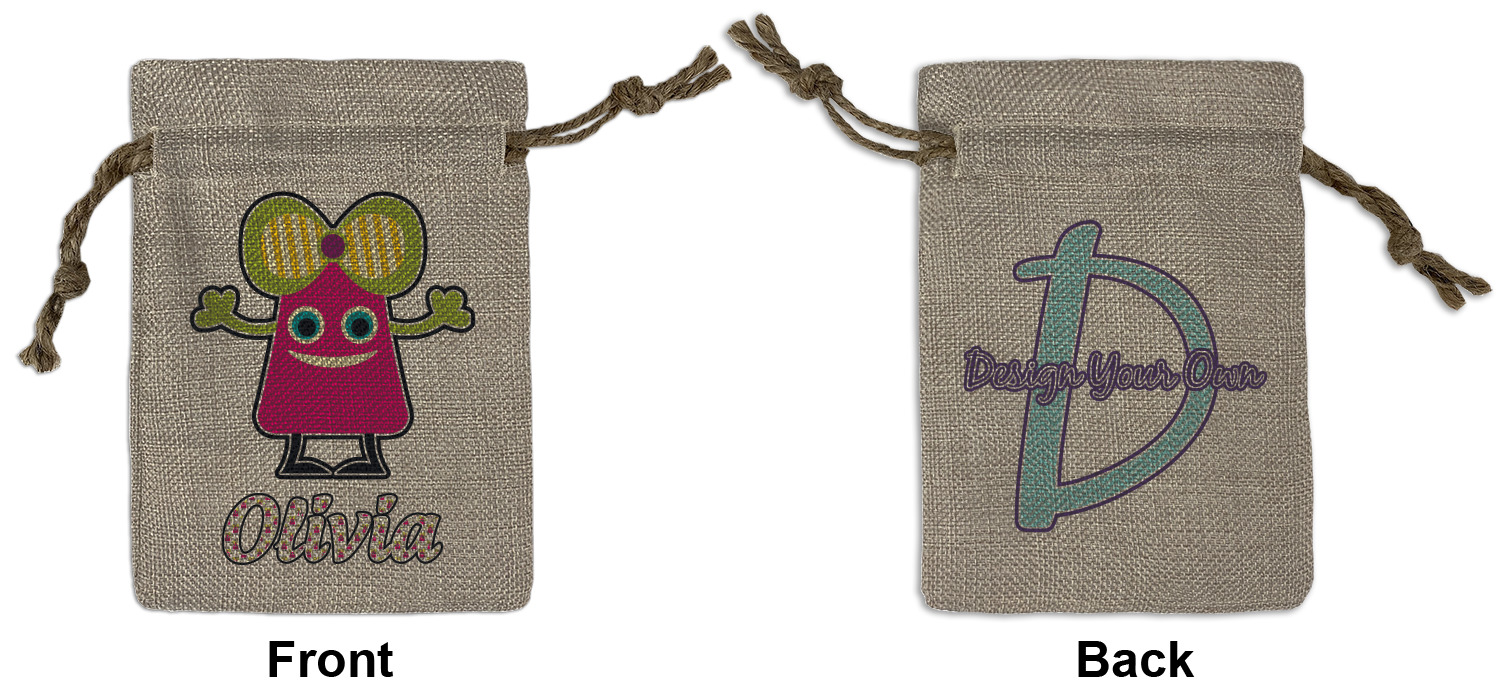 We sell our Burlap Gift Bags in 3 variant sized bags. Made with burlap polyester, each personalized bag can be secured with a twine drawstring pull. Your custom design is available to print on one side or both sides - completely up to you! The sizes of the bags measure approximately 4.5" x 6.5" for the smallest size, 6.5" x 8.0" for the medium size, and 6.5" x 13.5" for the large-sized bag.