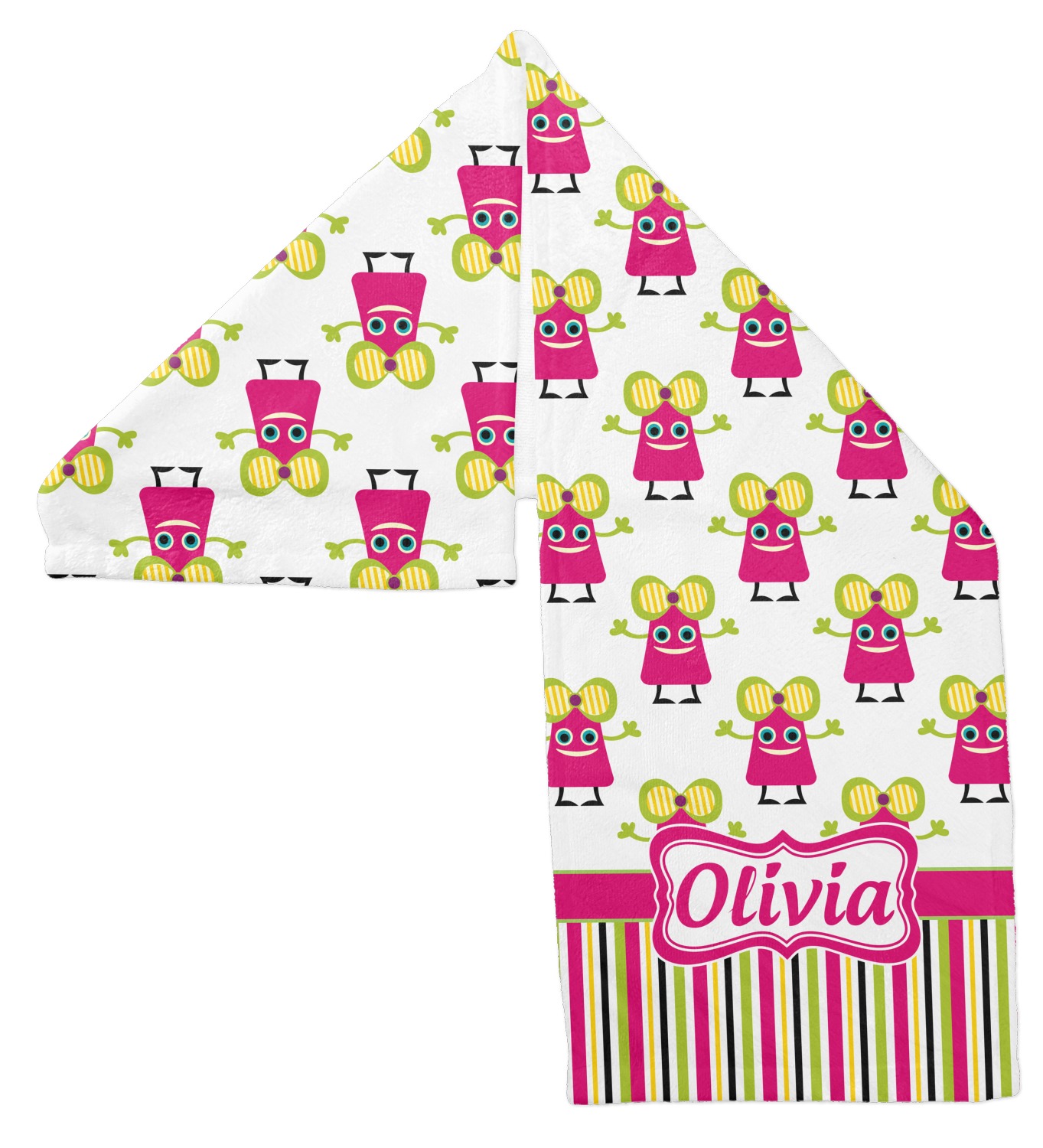Not all little monsters have to be scary. Our one of kind girly girl monster pattern will sure to delight your little one. This little hot pink monster is decorated with a huge green, yellow, and purple bow. Set on a white background she is just begging for a hug. A classic candy striped pattern below using coordinating colors brings this design together. A wide hot pink band trimmed in lime green adds a designer touch.