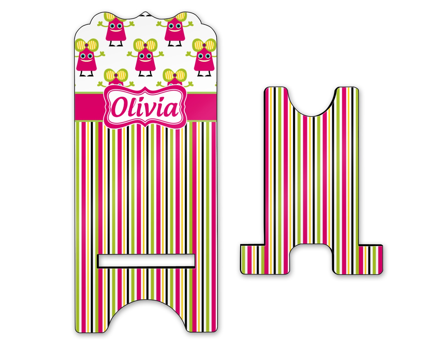 Not all little monsters have to be scary. Our one of kind girly girl monster pattern will sure to delight your little one. This little hot pink monster is decorated with a huge green, yellow, and purple bow. Set on a white background she is just begging for a hug. A classic candy striped pattern below using coordinating colors brings this design together. A wide hot pink band trimmed in lime green adds a designer touch.