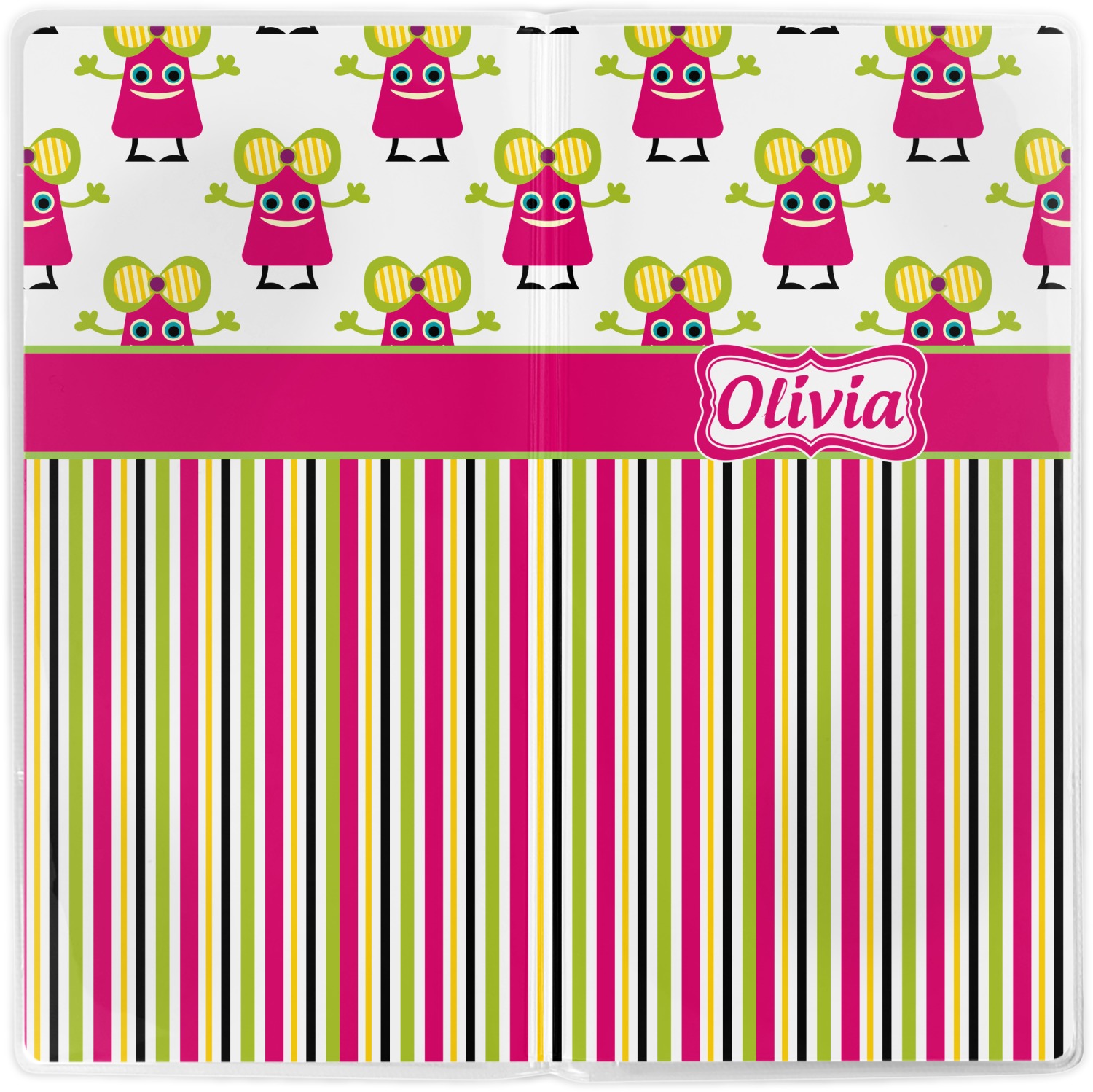 Not all little monsters have to be scary. Our one of kind girly girl monster pattern will sure to delight your little one. This little hot pink monster is decorated with a huge green, yellow, and purple bow. Set on a white background she is just begging for a hug. A classic candy striped pattern below using coordinating colors brings this design together. A wide hot pink band trimmed in lime green adds a designer touch.