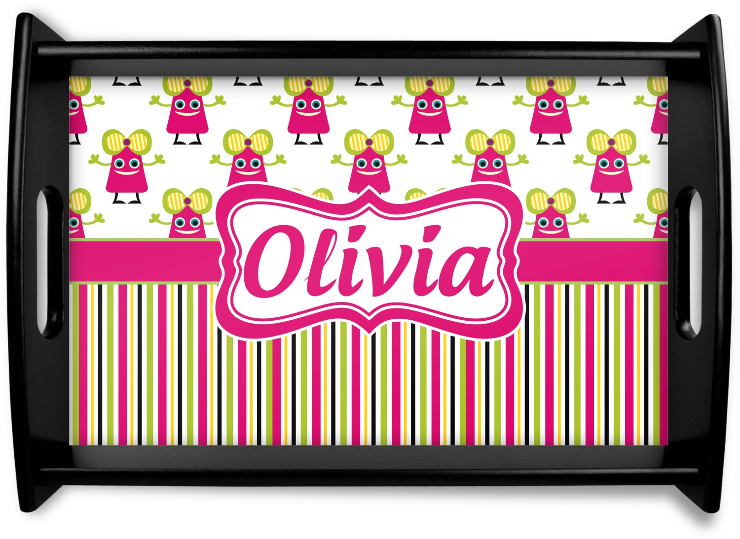 This serving tray with handles features square edges and two rounded sides, creating a very modern look. Each side is fabricated from a beautifully cut, natural wood. The bottom of the interior of the tray displays your customized design in bright, vibrant color. The tray is sold in both a black color and a natural wood look. Each variation of the wood serving tray has two sizes: Small, which is 14" x 10" x 2.25", and Large, which is 19.5" x 13.5" x 2.75".