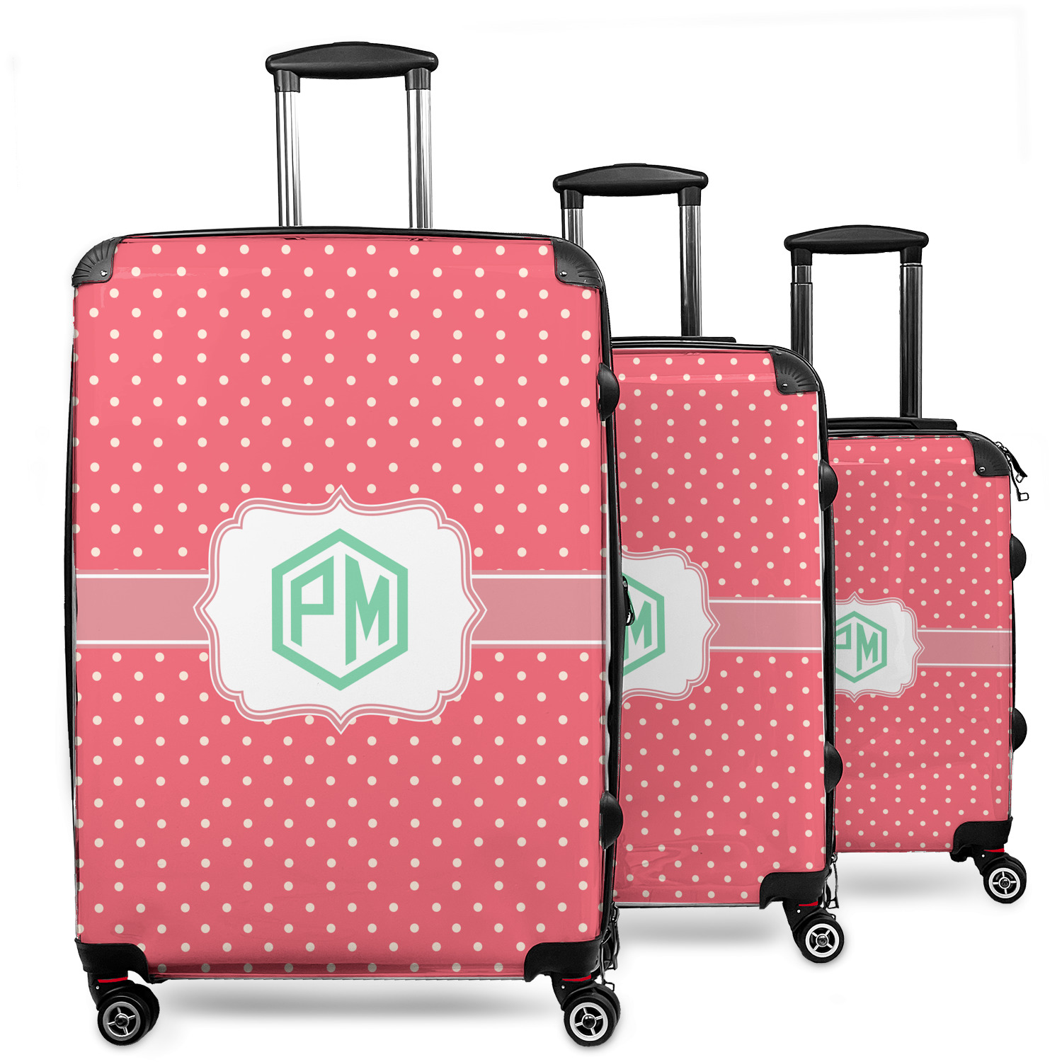 Your suitcases will be personalized on the front, while the back and sides are a sleek charcoal color. On the side opposite of the side handle there are rubber feet to allow it to safely lay on its side on a luggage belt. These are a lightweight hard shell luggage option that will fit just about anyone's needs. The sizes and weights of each suitcase are below: