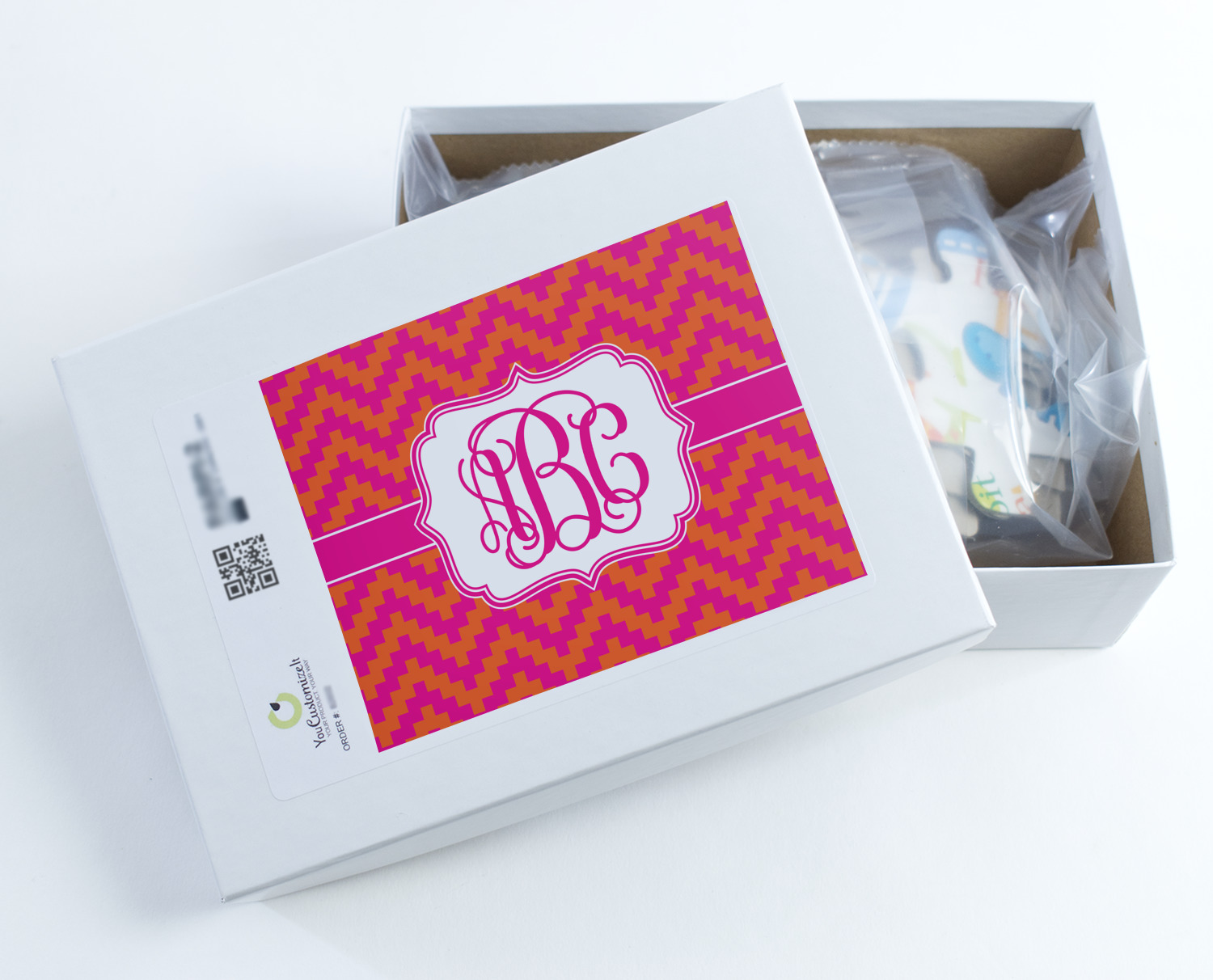 The pixelated chevron stripe pattern alternates between the hot pink and orange. The design has a classic ribbon in hot pink with white stripes. The decorative rectangular label is also in hot pink and white. The personalization is the gorgeous interlocking monogram in hot pink to pull the entire design together.