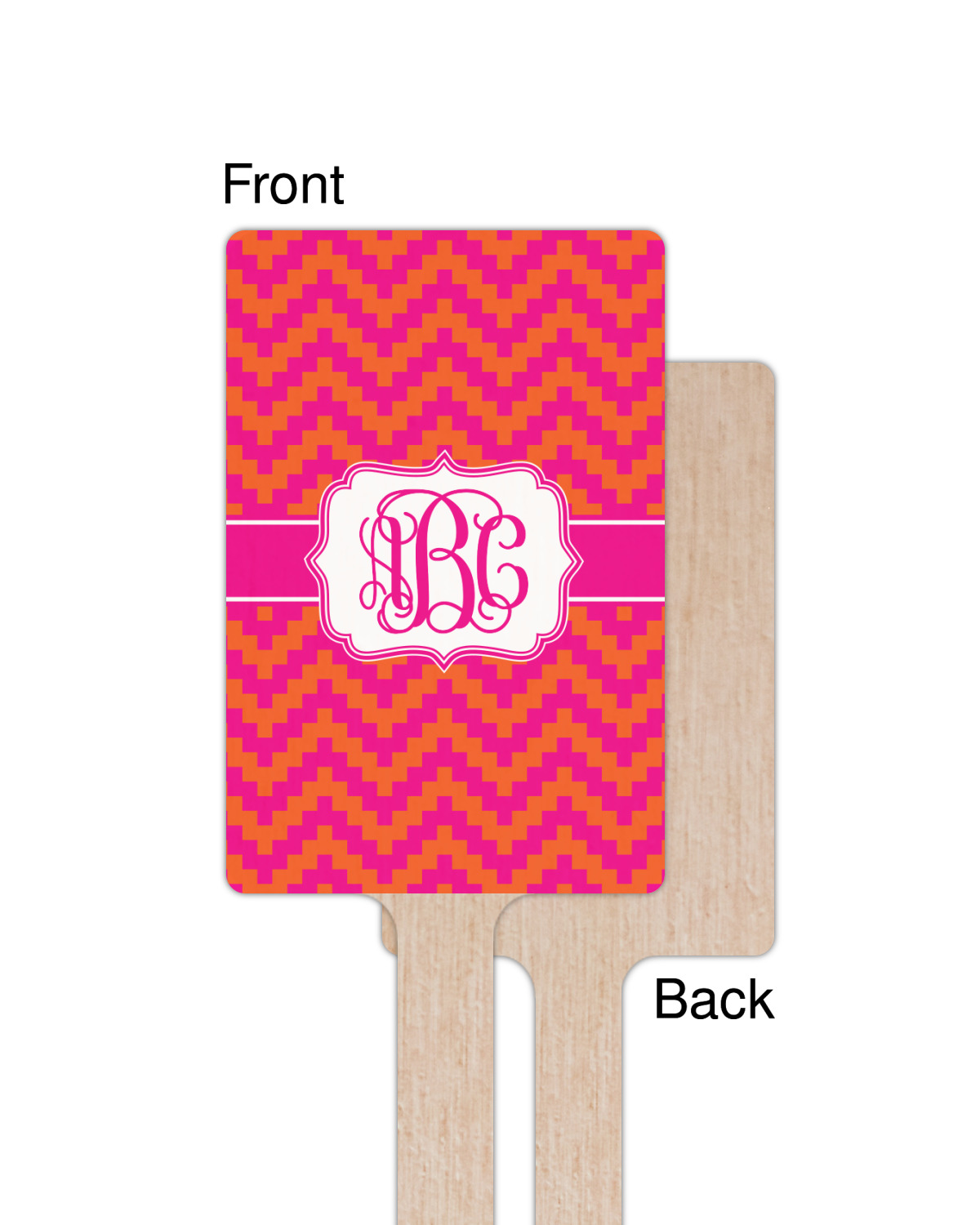 The pixelated chevron stripe pattern alternates between the hot pink and orange. The design has a classic ribbon in hot pink with white stripes. The decorative rectangular label is also in hot pink and white. The personalization is the gorgeous interlocking monogram in hot pink to pull the entire design together.