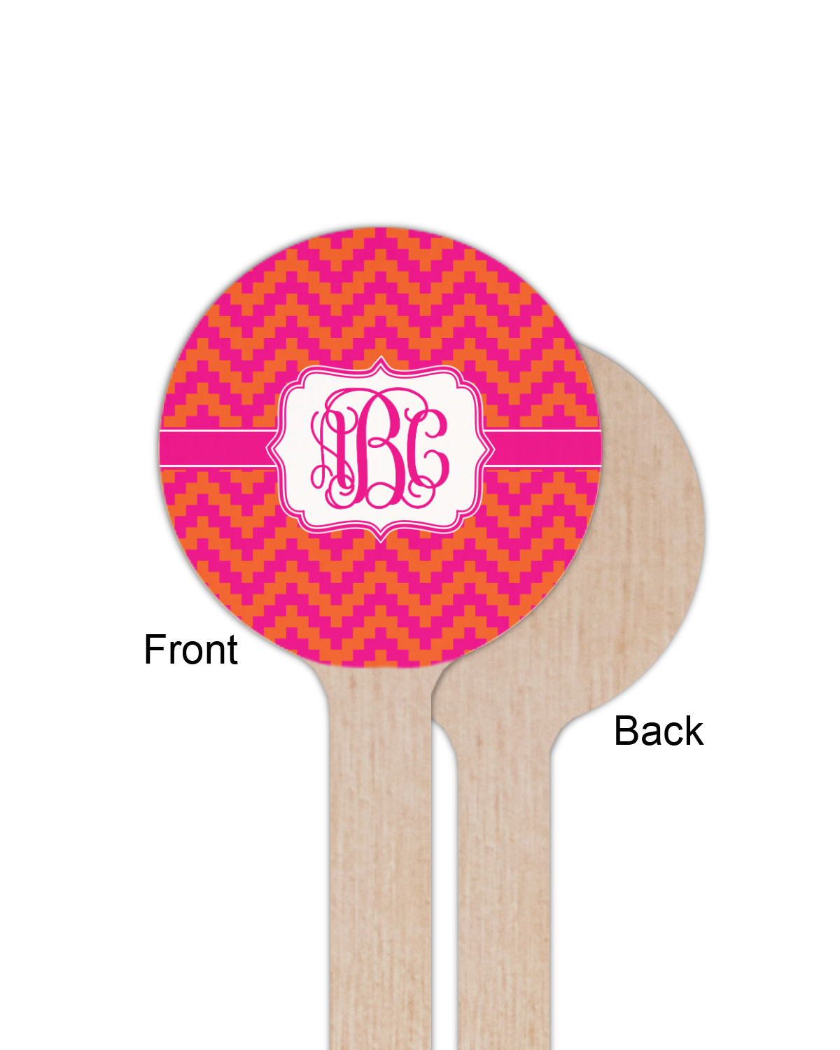 The pixelated chevron stripe pattern alternates between the hot pink and orange. The design has a classic ribbon in hot pink with white stripes. The decorative rectangular label is also in hot pink and white. The personalization is the gorgeous interlocking monogram in hot pink to pull the entire design together.