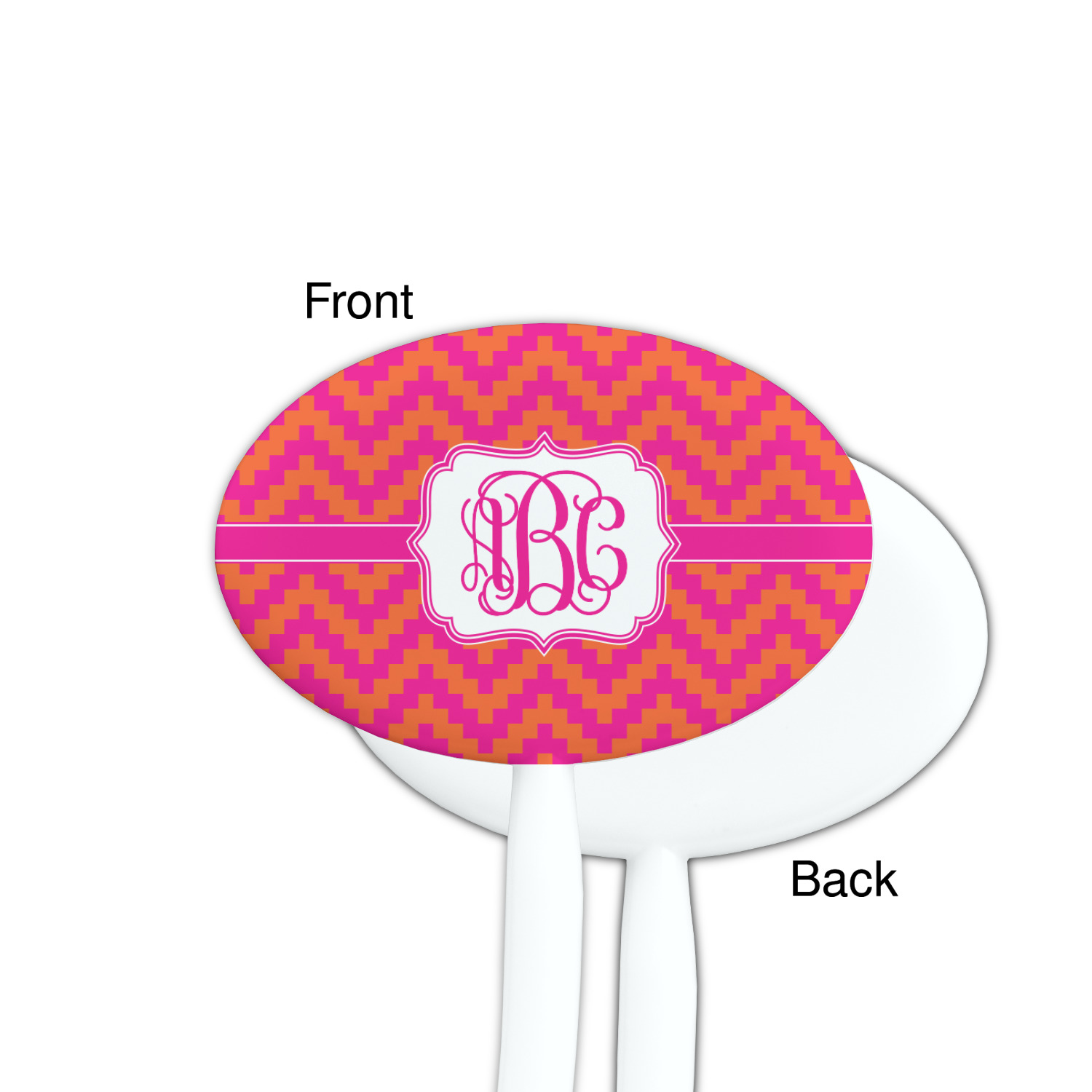The pixelated chevron stripe pattern alternates between the hot pink and orange. The design has a classic ribbon in hot pink with white stripes. The decorative rectangular label is also in hot pink and white. The personalization is the gorgeous interlocking monogram in hot pink to pull the entire design together.