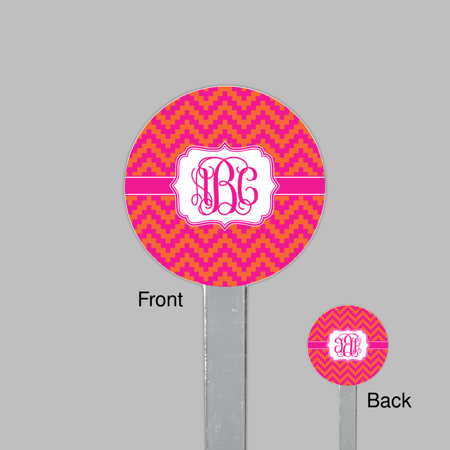 The pixelated chevron stripe pattern alternates between the hot pink and orange. The design has a classic ribbon in hot pink with white stripes. The decorative rectangular label is also in hot pink and white. The personalization is the gorgeous interlocking monogram in hot pink to pull the entire design together.