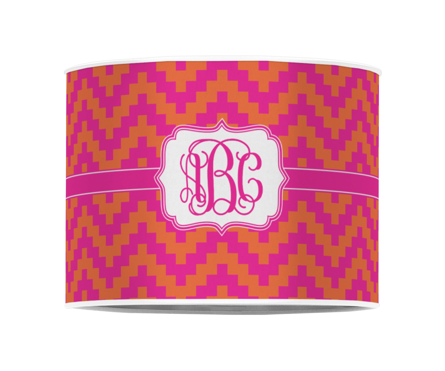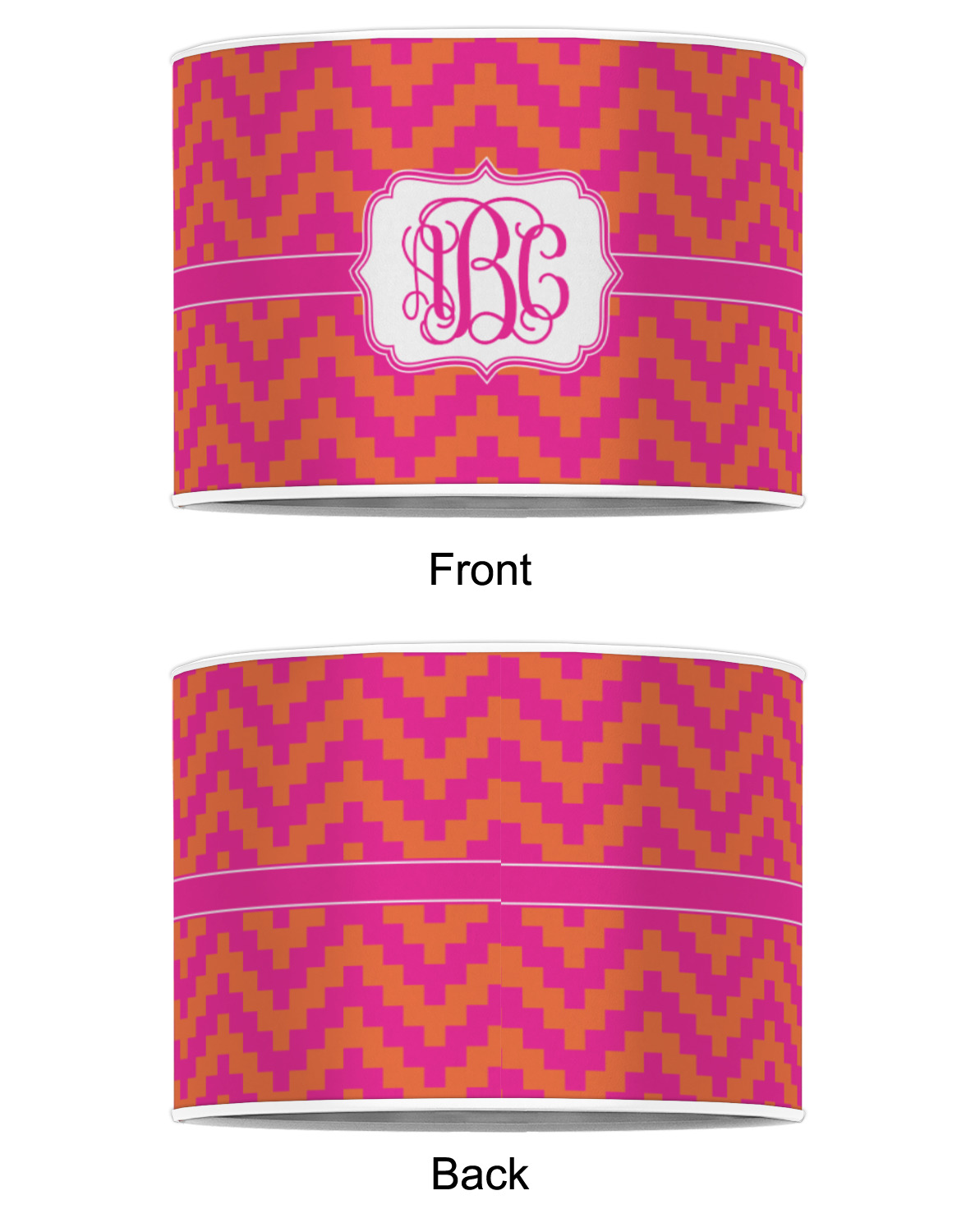 The pixelated chevron stripe pattern alternates between the hot pink and orange. The design has a classic ribbon in hot pink with white stripes. The decorative rectangular label is also in hot pink and white. The personalization is the gorgeous interlocking monogram in hot pink to pull the entire design together.