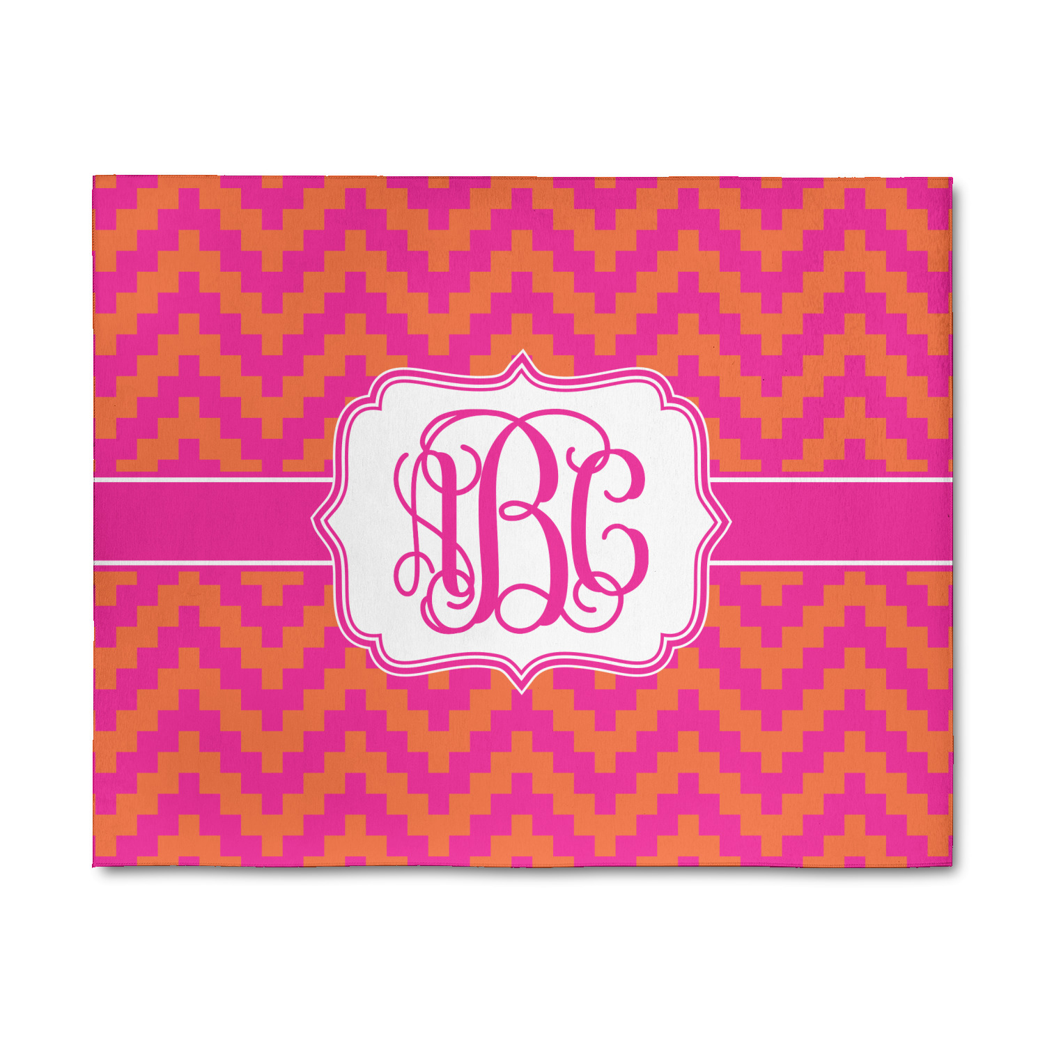 The pixelated chevron stripe pattern alternates between the hot pink and orange. The design has a classic ribbon in hot pink with white stripes. The decorative rectangular label is also in hot pink and white. The personalization is the gorgeous interlocking monogram in hot pink to pull the entire design together.