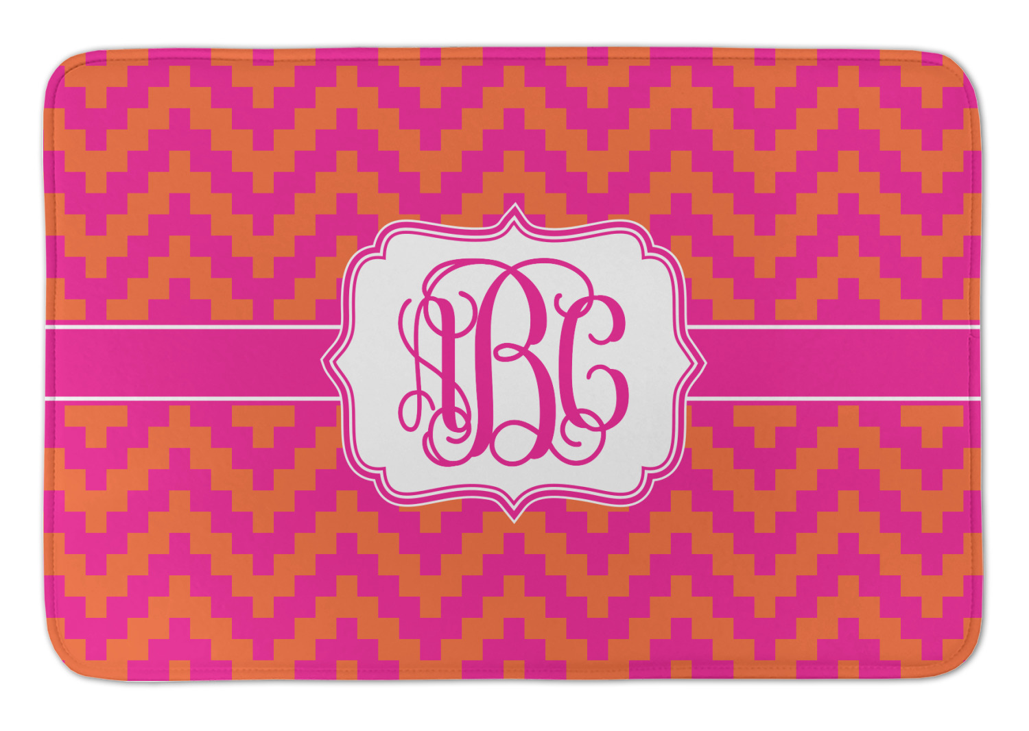 The pixelated chevron stripe pattern alternates between the hot pink and orange. The design has a classic ribbon in hot pink with white stripes. The decorative rectangular label is also in hot pink and white. The personalization is the gorgeous interlocking monogram in hot pink to pull the entire design together.